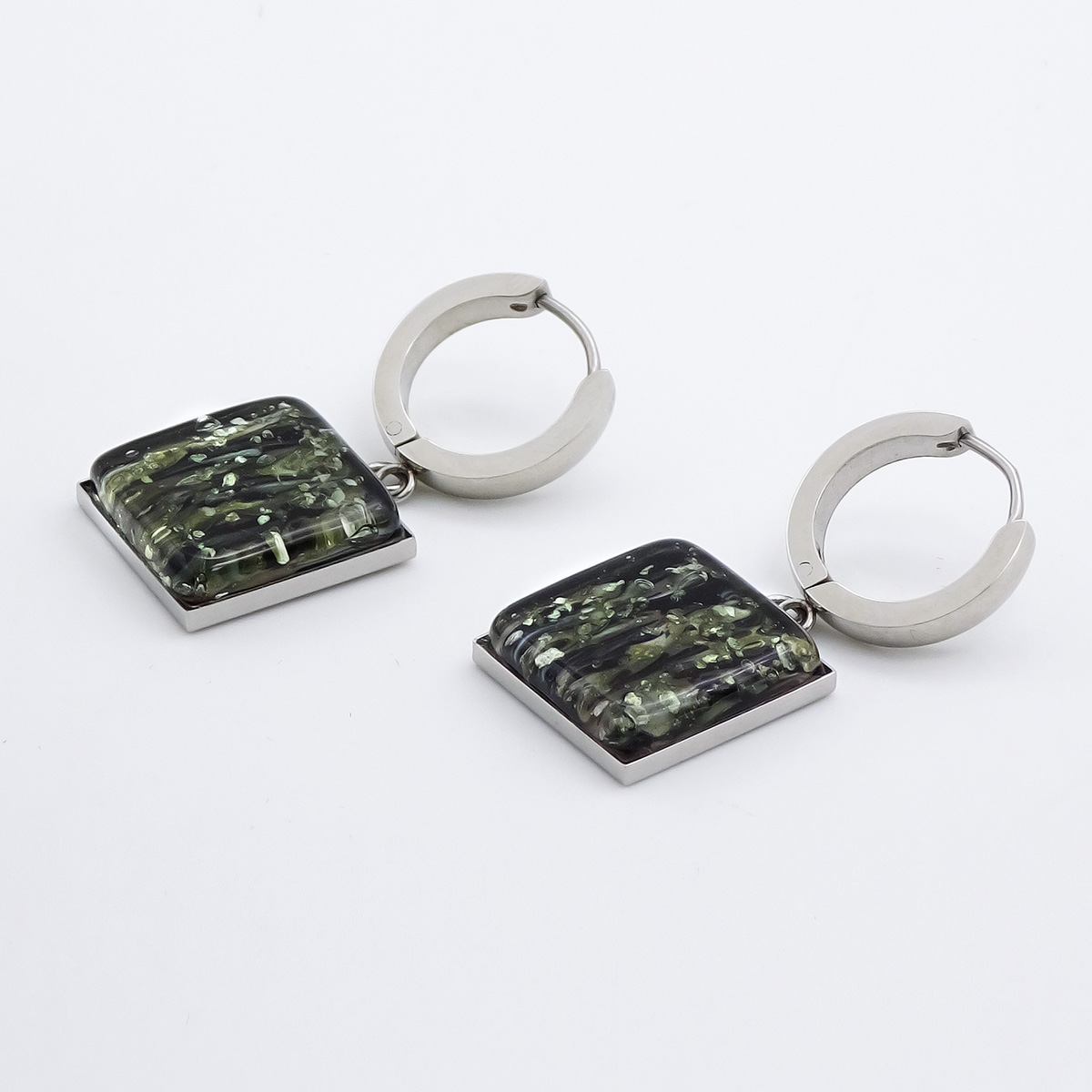 Серьги изготовлены из муранского стекла и гипоаллергенной ювелирной стали, что очень важно для людей с чувствительной кожей. Металл не темнеет и не подвергается воздействиям окружающей среды, надолго обеспечивая красивый внешний вид изделия. Длина серег - 3,5 см. Размер  стеклянного элемента 1,6х1,6 см. Вес - 11 гр.