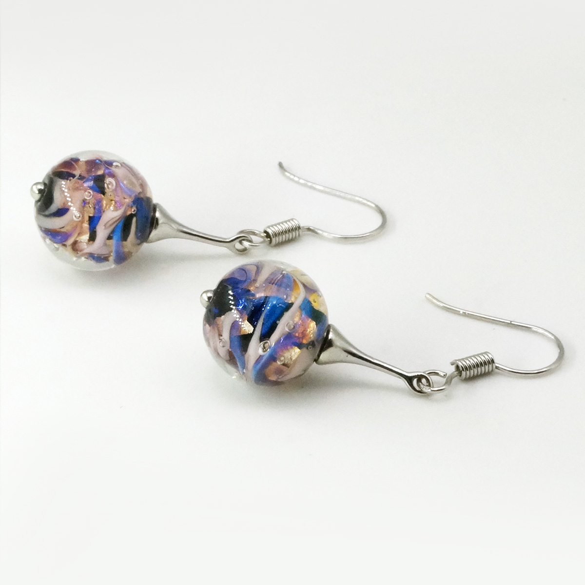 Серьги изготовлены из муранского стекла и гипоаллергенной ювелирной стали, что очень важно для людей с чувствительной кожей. Металл не темнеет и не подвергается воздействиям окружающей среды, надолго обеспечивая красивый внешний вид изделия. Длина серег - 3 см. Диаметр стеклянного шарика - 1,2 см.  Вес обеих серег - 5 гр.