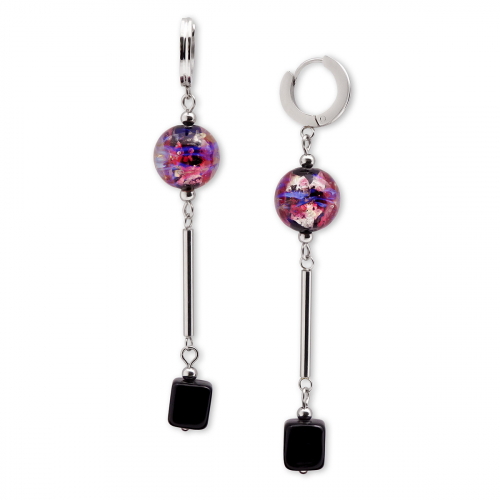 Серьги изготовлены из муранского стекла и гипоаллергенной ювелирной стали, что очень важно для людей с чувствительной кожей. Металл не темнеет и не подвергается воздействиям окружающей среды, надолго обеспечивая красивый внешний вид изделия. Длина серег - 5,5 см. Диаметр стеклянных шариков - 1 и 1,5 см.  Вес обеих серег - 14 гр.