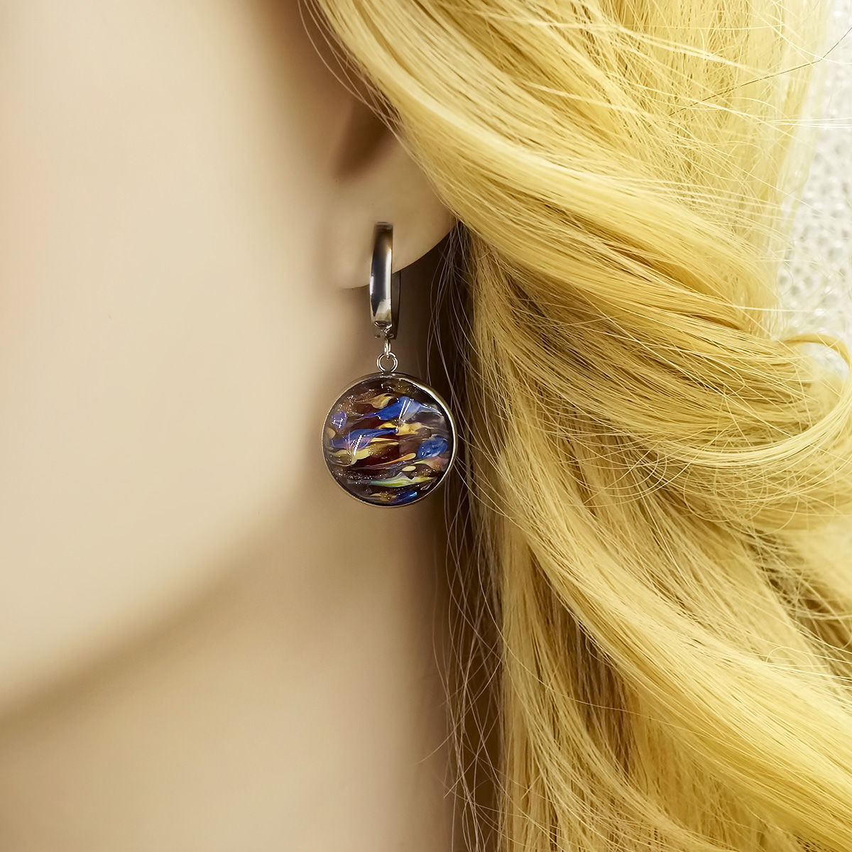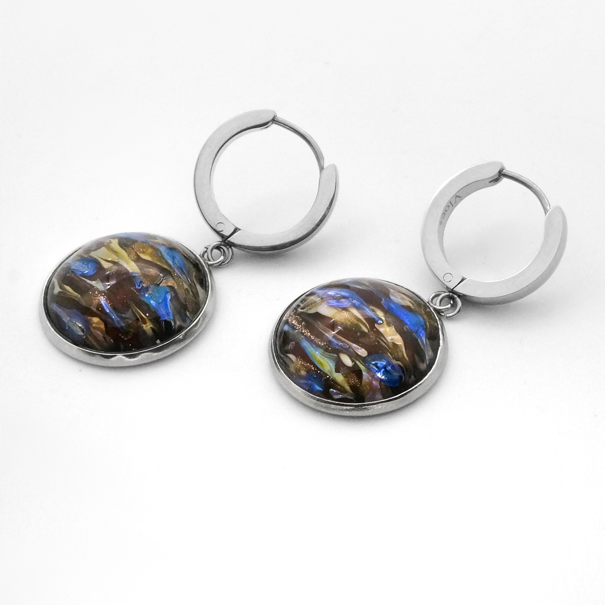 Серьги изготовлены из муранского стекла и гипоаллергенной ювелирной стали, что очень важно для людей с чувствительной кожей. Металл не темнеет и не подвергается воздействиям окружающей среды, надолго обеспечивая красивый внешний вид изделия. Длина серег - 4 см. Диаметр стеклянного элемента - 2 см. Вес - 12 гр.