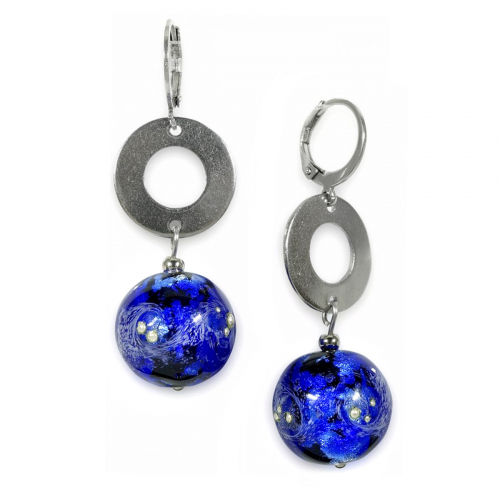 Серьги изготовлены из муранского стекла и гипоаллергенной ювелирной стали, что очень важно для людей с чувствительной кожей. Металл не темнеет и не подвергается воздействиям окружающей среды, надолго обеспечивая красивый внешний вид изделия. Длина серег - 5 см. Диаметр стеклянного шарика - 1,5 см.  Вес обеих серег - .