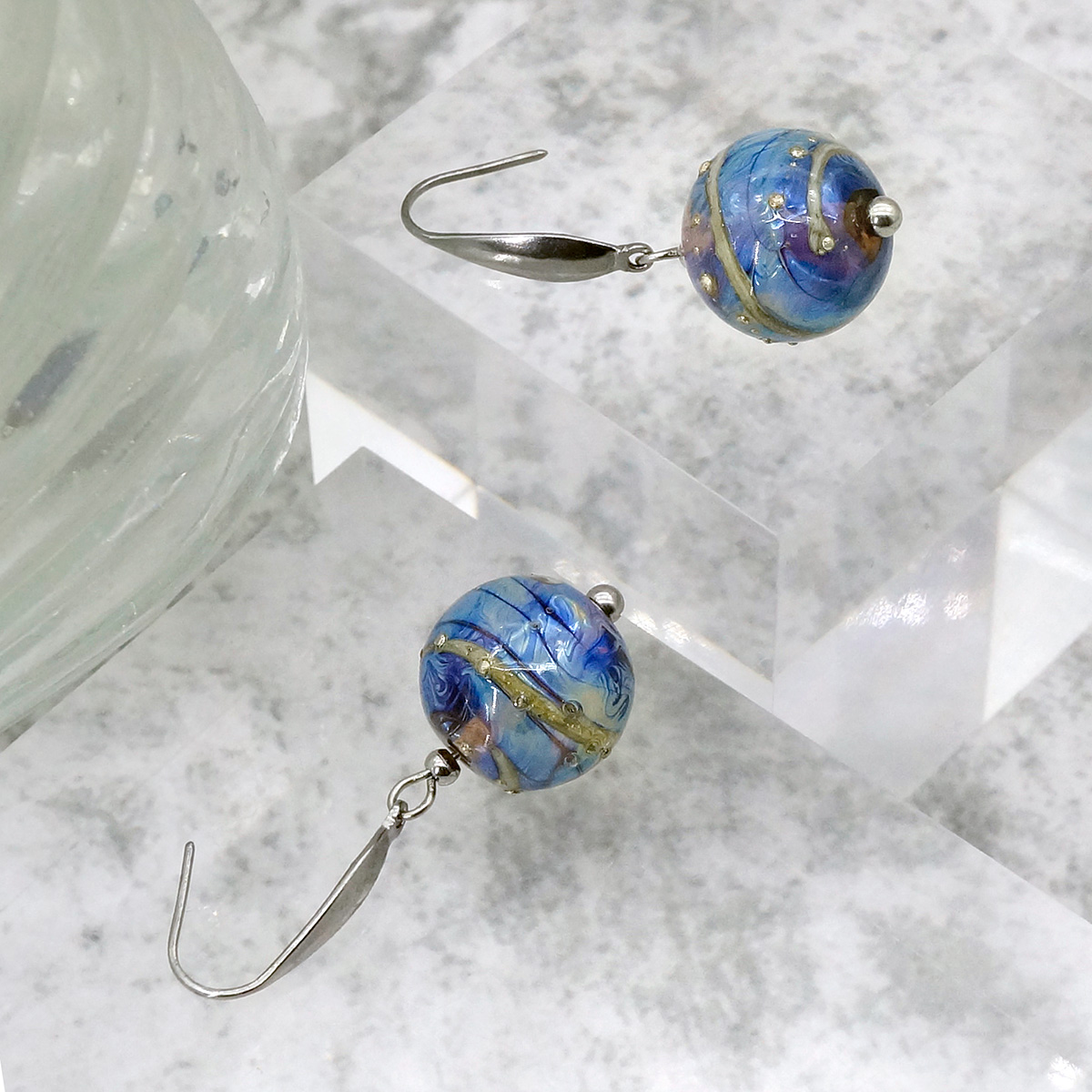 Серьги изготовлены из муранского стекла и гипоаллергенной ювелирной стали, что очень важно для людей с чувствительной кожей. Металл не темнеет и не подвергается воздействиям окружающей среды, надолго обеспечивая красивый внешний вид изделия. Длина серег - 4 см. Диаметр стеклянного шарика - 1,5 см.  Вес обеих серег - 11 гр.