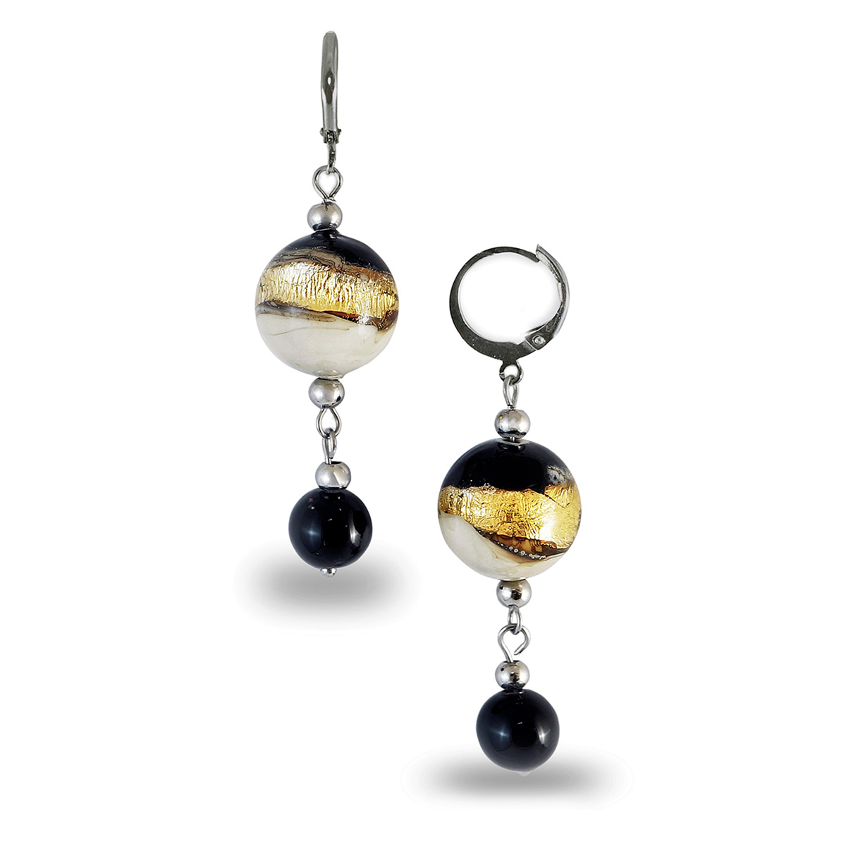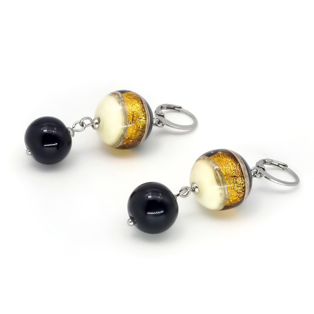 Серьги изготовлены из муранского стекла и гипоаллергенной ювелирной стали, что очень важно для людей с чувствительной кожей. Металл не темнеет и не подвергается воздействиям окружающей среды, надолго обеспечивая красивый внешний вид изделия. Длина серег - 5,5 см. Диаметр стеклянных шариков - 1 и 1,5 см. Вес обеих серег - 14.