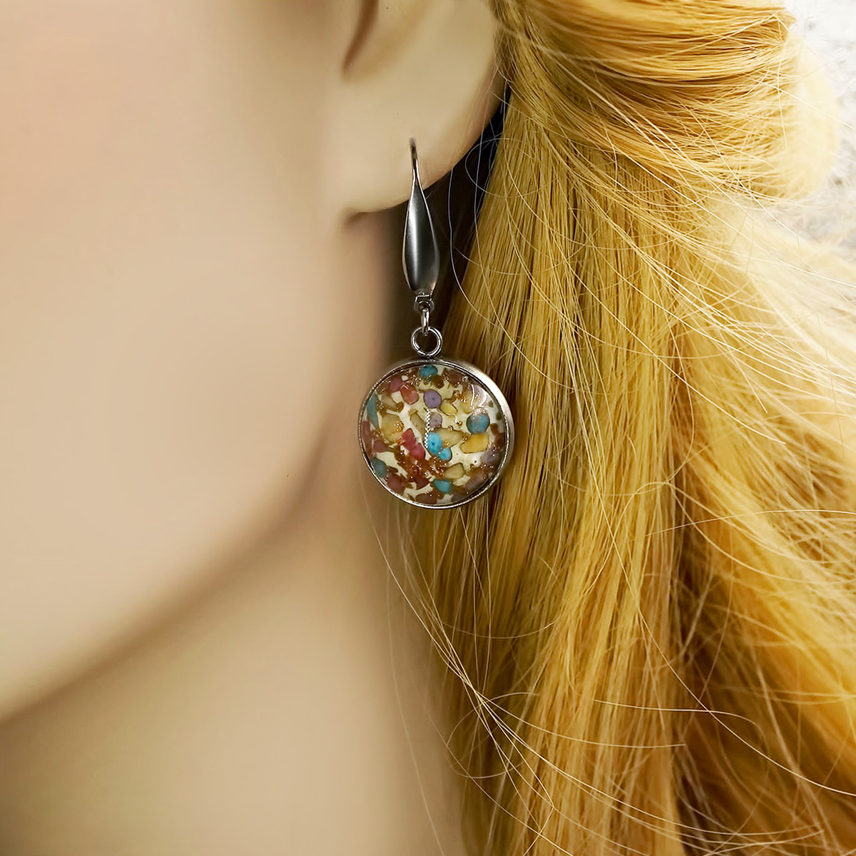 Серьги изготовлены из муранского стекла и гипоаллергенной ювелирной стали, что очень важно для людей с чувствительной кожей. Металл не темнеет и не подвергается воздействиям окружающей среды, надолго обеспечивая красивый внешний вид изделия. Длина серег - 4 см. Диаметр стеклянного элемента - 2 см.  Вес обеих серег - 9 гр.