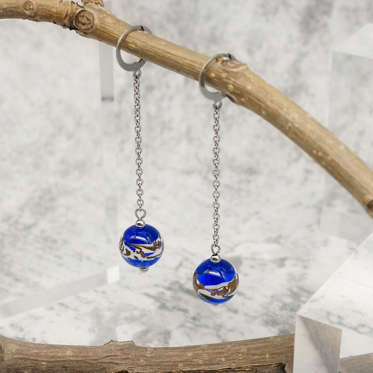 Серьги изготовлены из муранского стекла и гипоаллергенной ювелирной стали, что очень важно для людей с чувствительной кожей. Металл не темнеет и не подвергается воздействиям окружающей среды, надолго обеспечивая красивый внешний вид изделия. Длина серег - 7 см. Диаметр стеклянного шарика - 1,2 см.  Вес обеих серег - 6,5 гр.