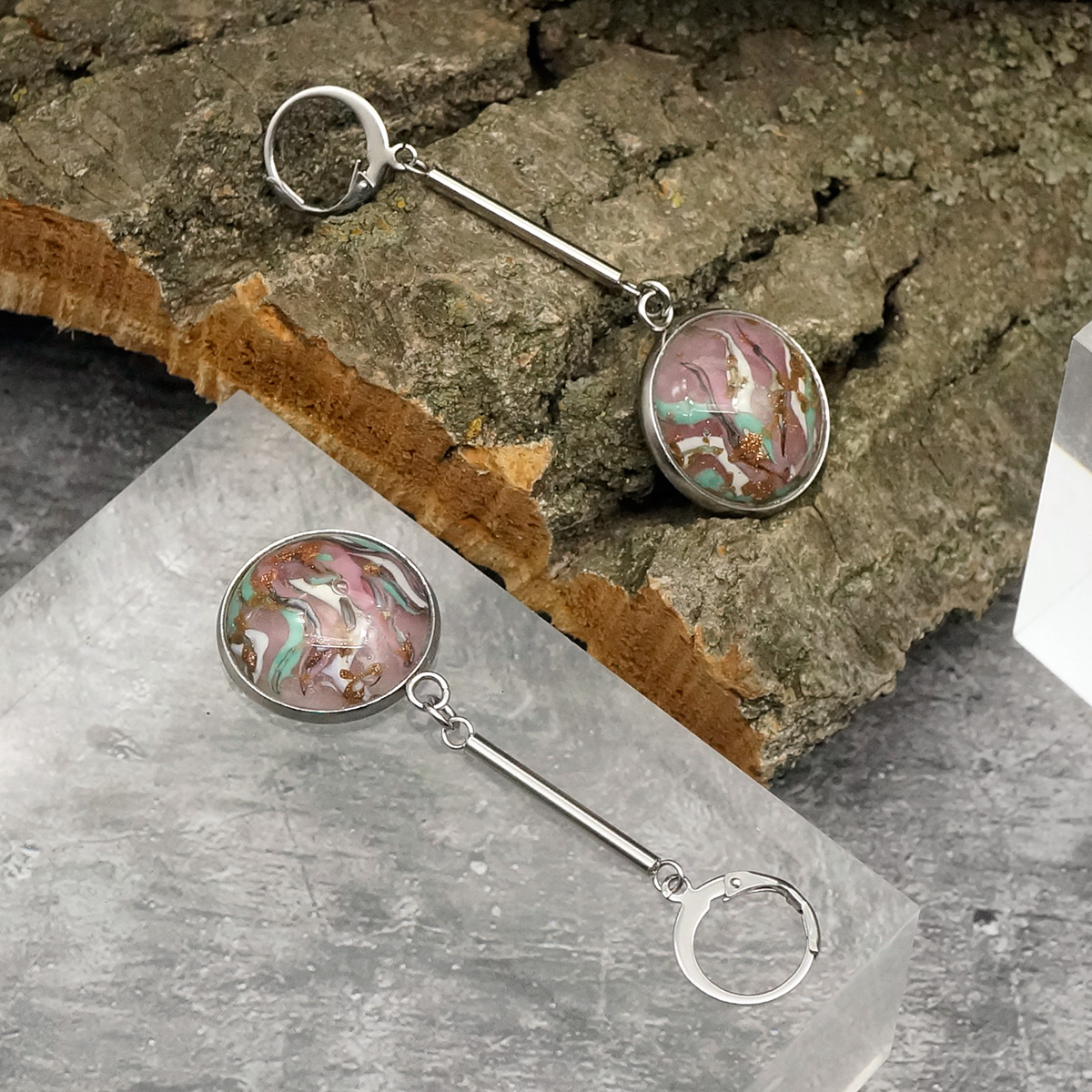 Серьги изготовлены из муранского стекла и гипоаллергенной ювелирной стали, что очень важно для людей с чувствительной кожей. Металл не темнеет и не подвергается воздействиям окружающей среды, надолго обеспечивая красивый внешний вид изделия. Длина серег - 6 см. Диаметр стеклянного элемента - 2 см.  Вес обеих серег - 10 гр.