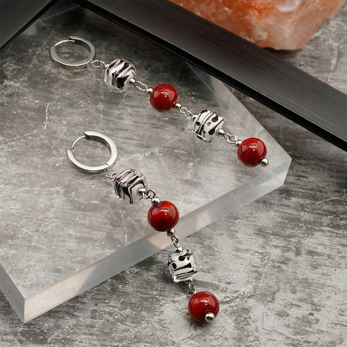 Серьги изготовлены из муранского стекла и гипоаллергенной ювелирной стали, что очень важно для людей с чувствительной кожей. Металл не темнеет и не подвергается воздействиям окружающей среды, надолго обеспечивая красивый внешний вид изделия. Длина серег - 7,5 см. Диаметр стеклянного шарика - 1 см. Размер кубика - 1 см. Вес - 20 гр.