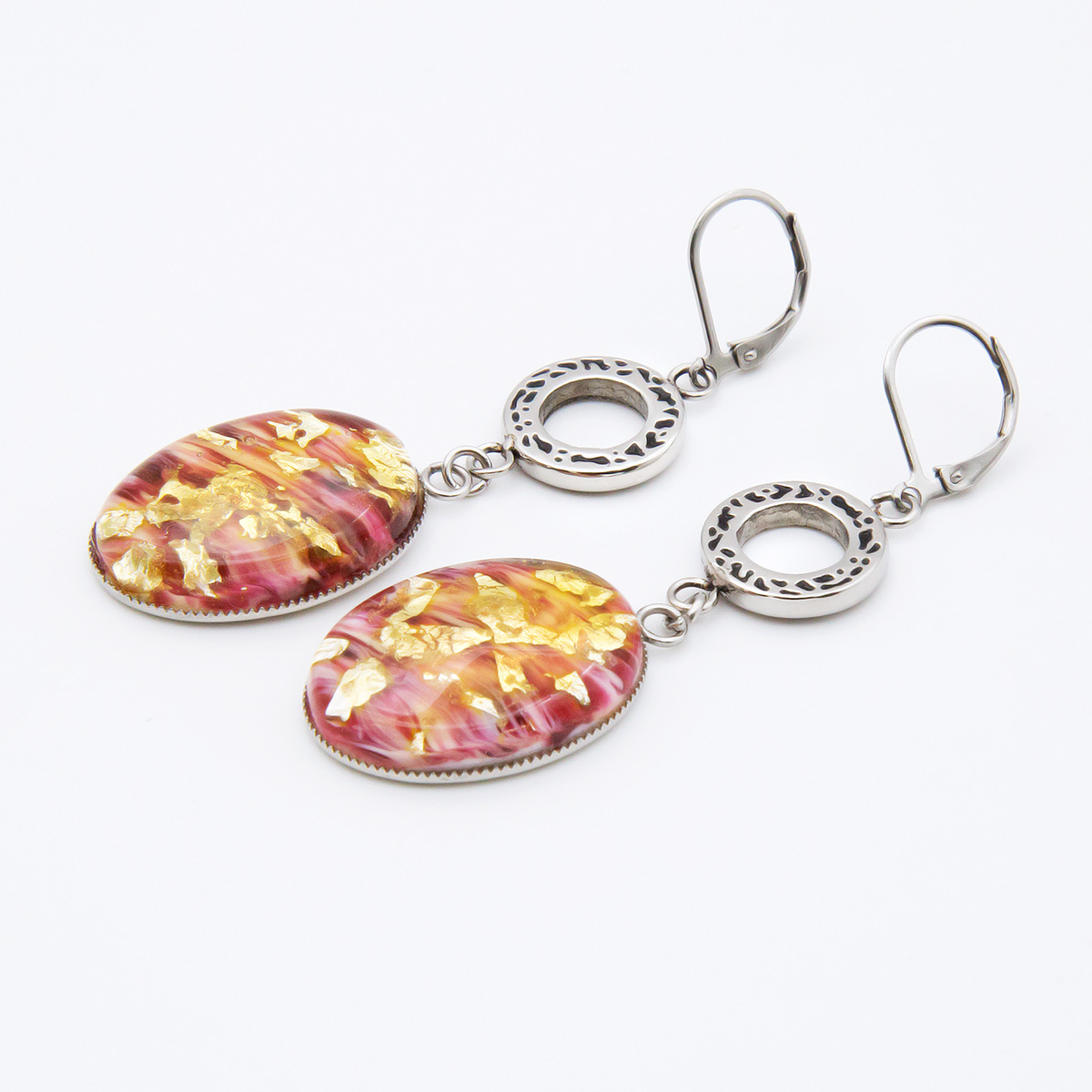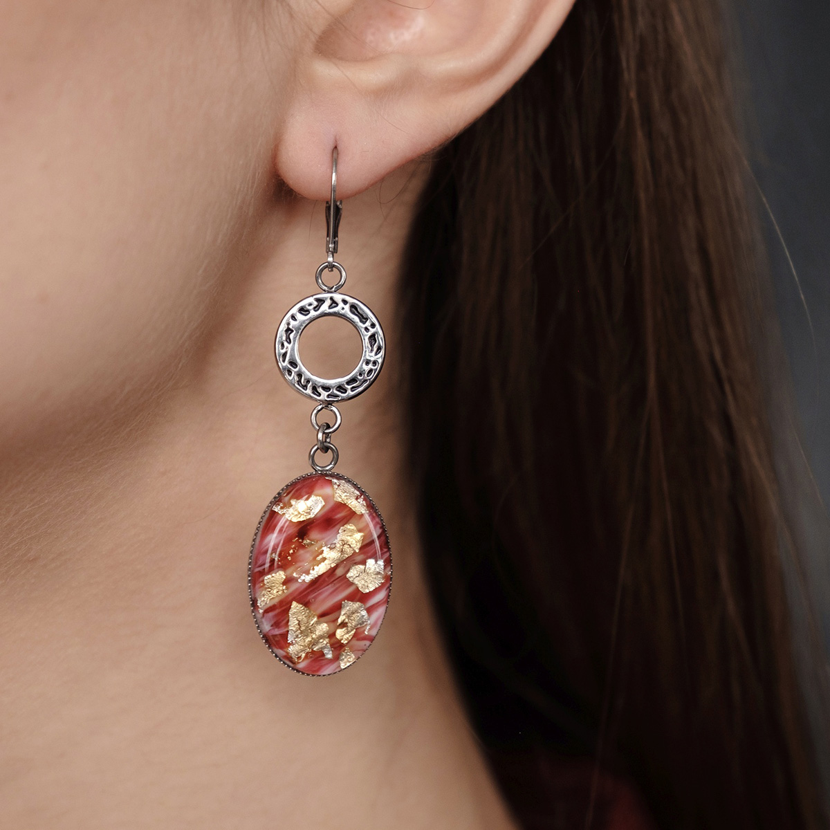 Серьги изготовлены из муранского стекла и гипоаллергенной ювелирной стали, что очень важно для людей с чувствительной кожей. Металл не темнеет и не подвергается воздействиям окружающей среды, надолго обеспечивая красивый внешний вид изделия. Длина серег - 6,5 см. Размер стеклянного элемента - 1,9х2,6 см.  Вес обеих серег - 14 гр.