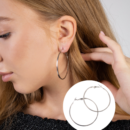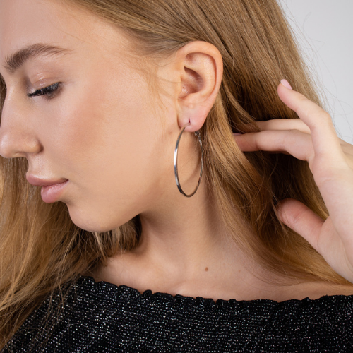 Описание Классические серебряные крупные серьги кольца никогда не выходят из моды. Крупные кольца сочетаются с любой одеждой, макияжем или прической. Бижутерные сережки-кольца не темнеют и не окисляются со временем, так как имеют стойкое к стиранию покрытие. Материал, из которого изготовлены украшения гипоаллергенный, что свойственно качественной фабричной бижутерии. Диаметр: 5 см. Замок: булавка. Состав: бижутерный сплав. Вес: 7гр.
