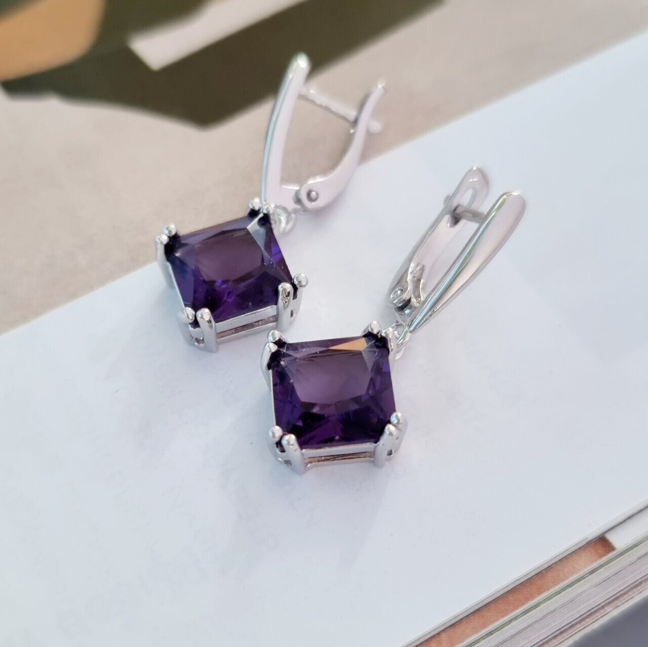 Описание Серьги коллекция "Дубай" покрытие посеребрение, камень фиолетовый блестящий. Вид застежки: английский. Размер: 3х1,5 см. Вес: 7 гр.
