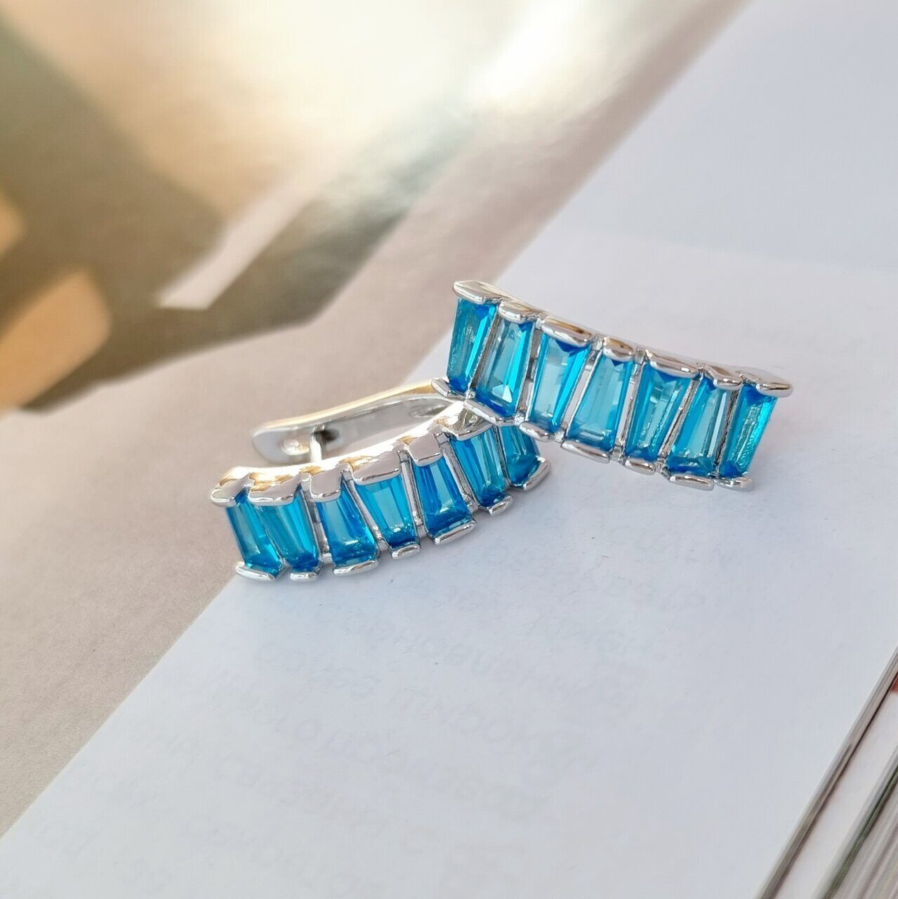 Описание Серьги коллекция "Дубай", цвет посеребрение, камень голубой блестящий. Размер: 2х0,5 см. Замок: английский. Вес: 5 гр.