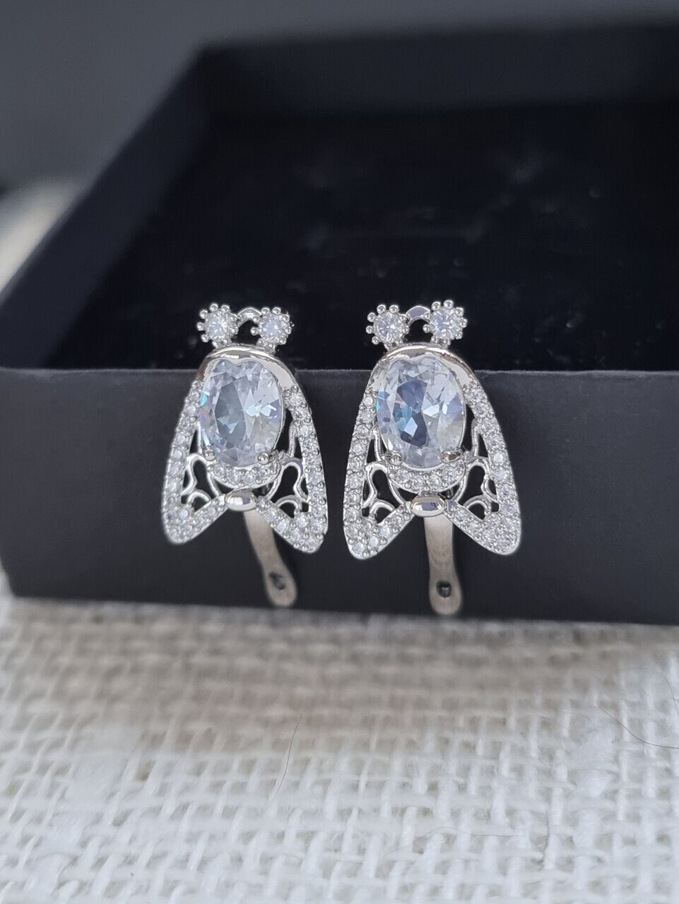 Описание Серьги покрытие посеребрение с прозрачным кристаллом и фианитами. Размер: 2*1,5 см. Вес: 6 гр. Материал: металл, кристалл, фианит. Замок: английский