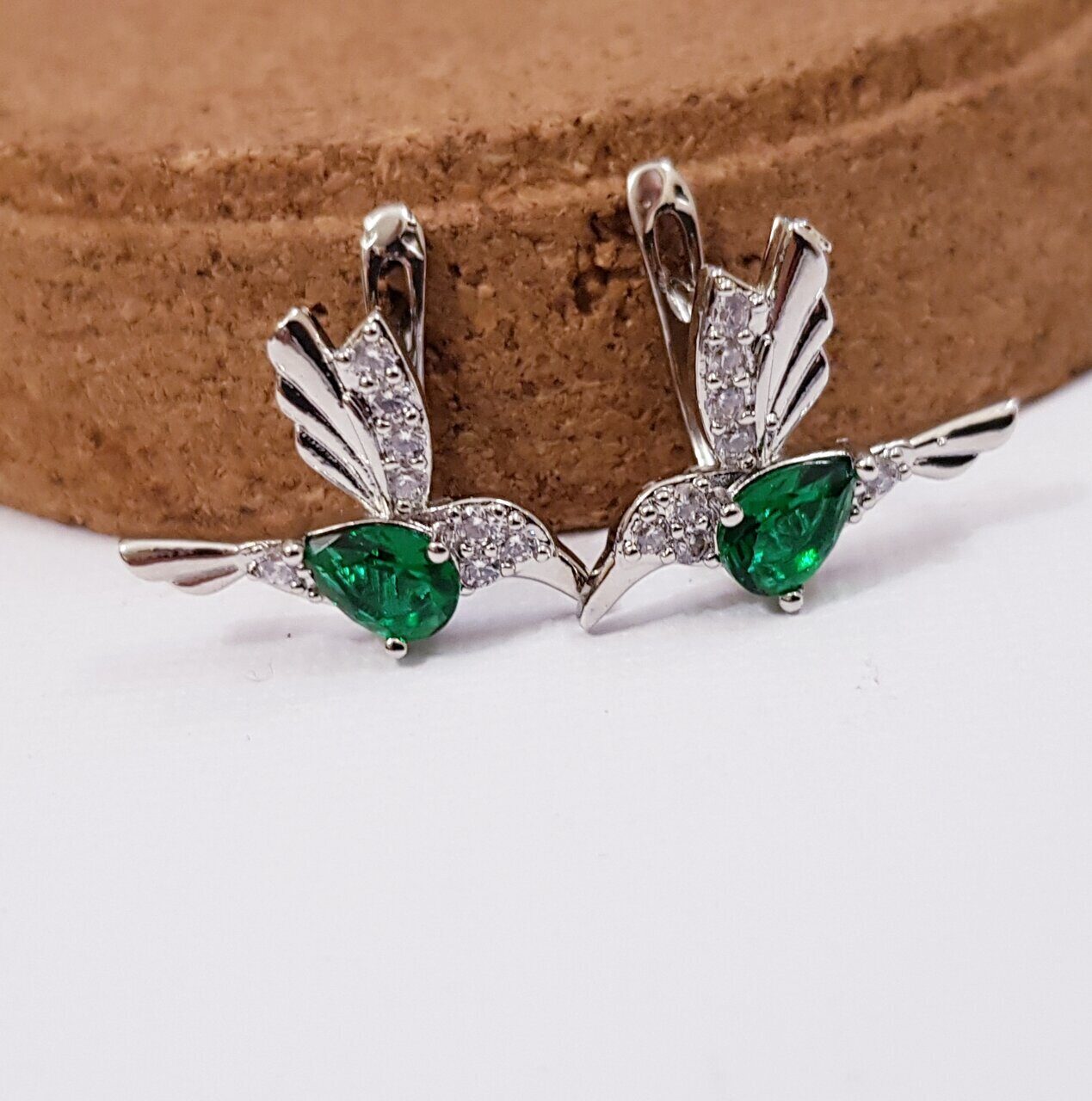 Описание Стильные серьги Птицы, под серебро, с зеленым фианитом, застежка - английская. Оригинальный стиль сережек подойдет к любому вашему образу, куда бы вы не собрались: учебу, работу, встреча с друзьями, вечеренку. Материал: металл, стразы. Размер: 2*1,6 см. Вес: 4 гр.