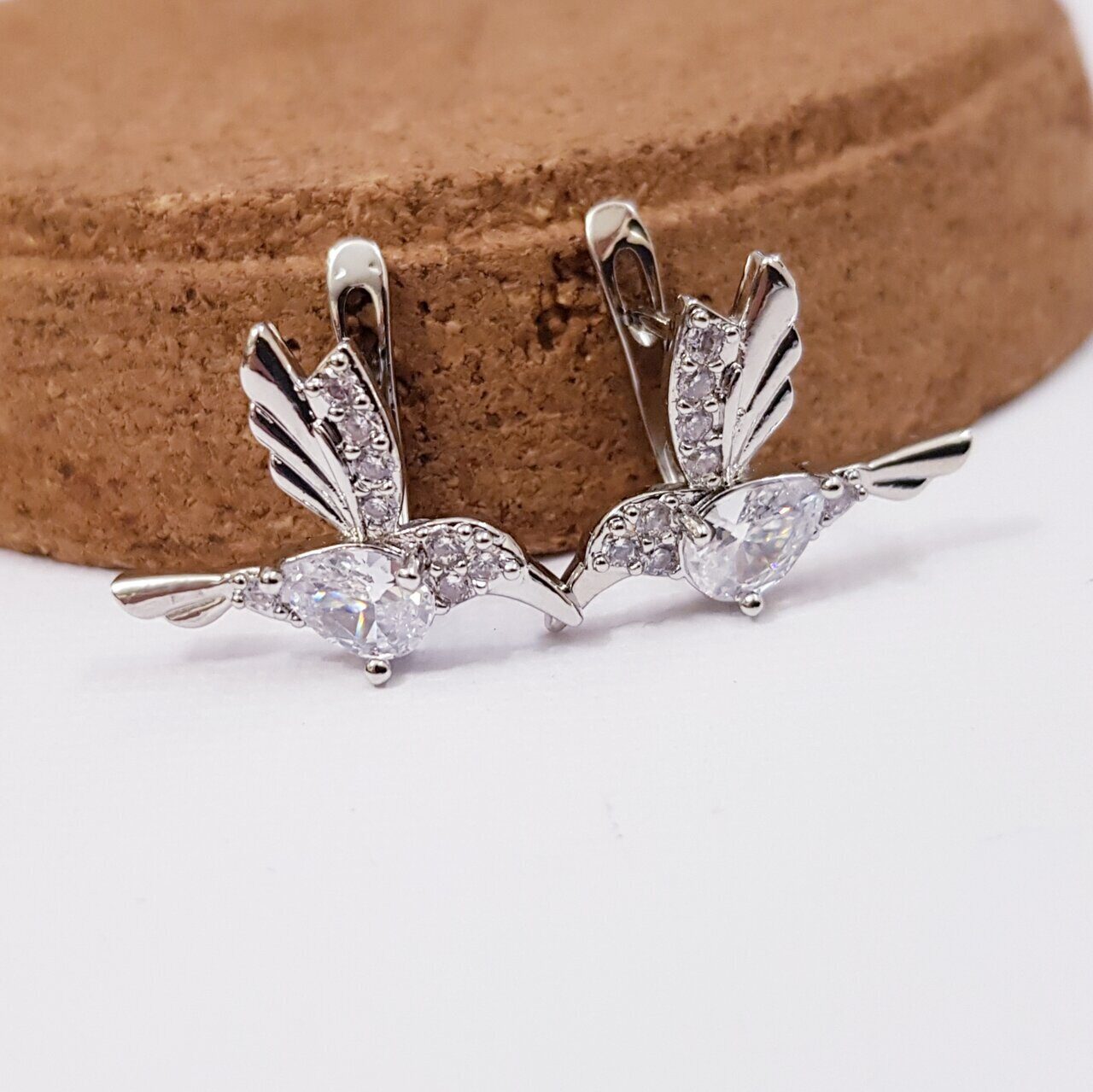 Описание Стильные серьги Птицы, под серебро, с прозразным фианитом, застежка - английская. Оригинальный стиль сережек подойдет к любому вашему образу, куда бы вы не собрались: учебу, работу, встреча с друзьями, вечеренку. Материал: металл, стразы. Размер: 2*1,6 см. Вес: 4 гр.