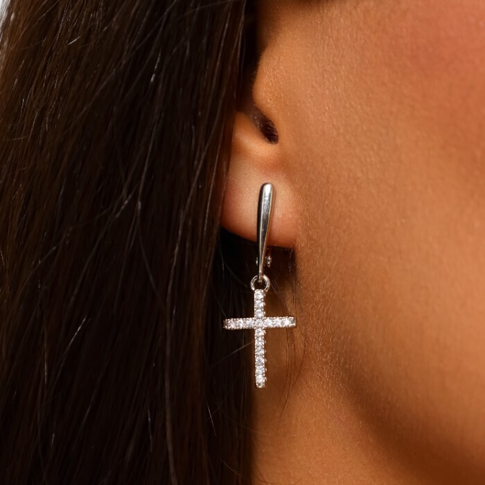 Серьги кресты висячие ювелирная бижутерия, покрытие посеребрение, вставка: фианиты, цвет: прозрачный, арт.214.885