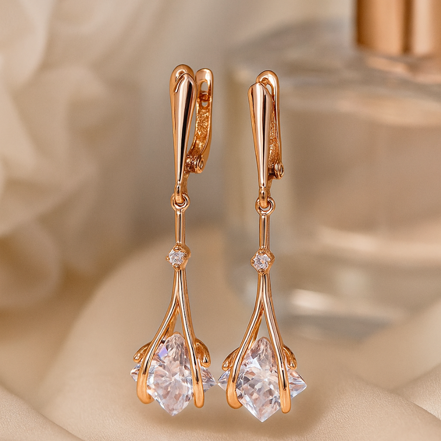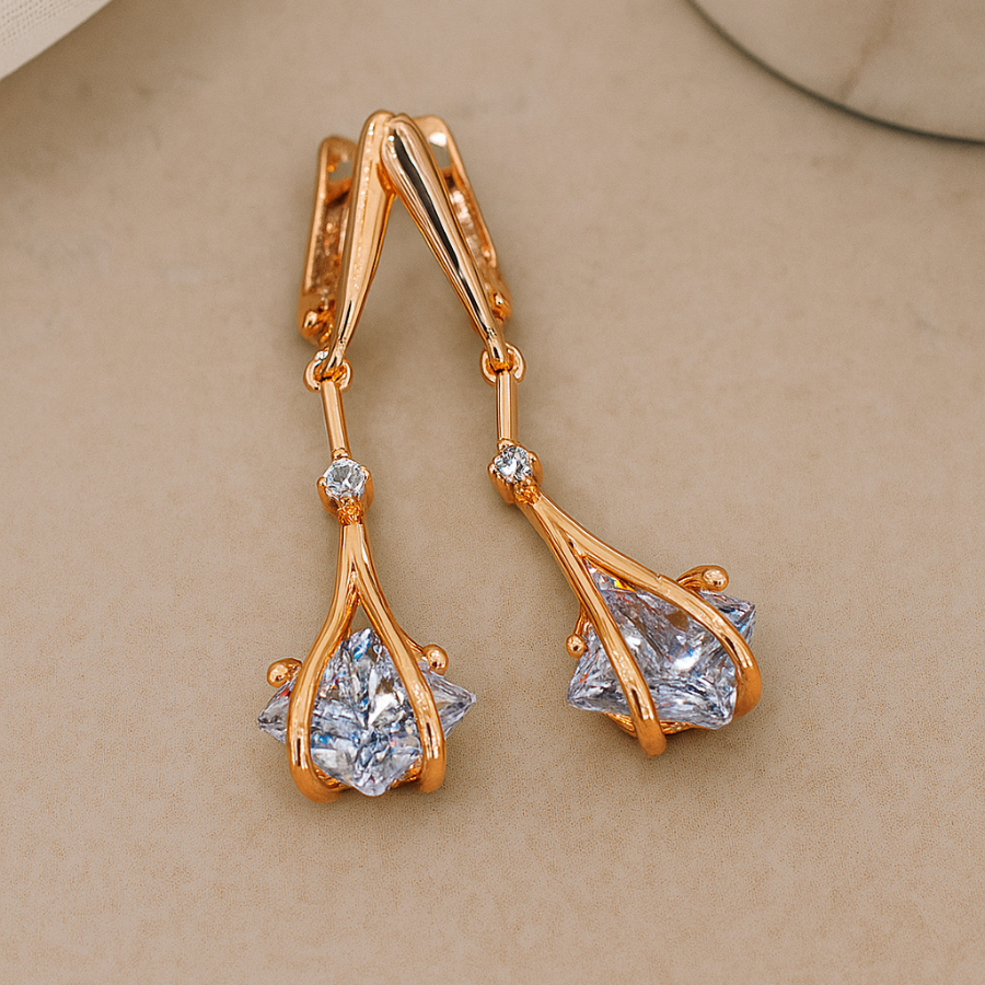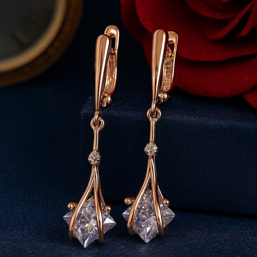 Серьги подвески длинные с белым камнем, покрытие позолота 585 пробы, арт.314.982
