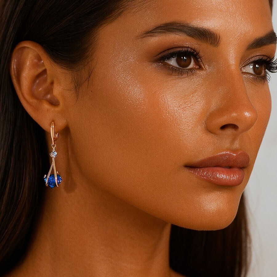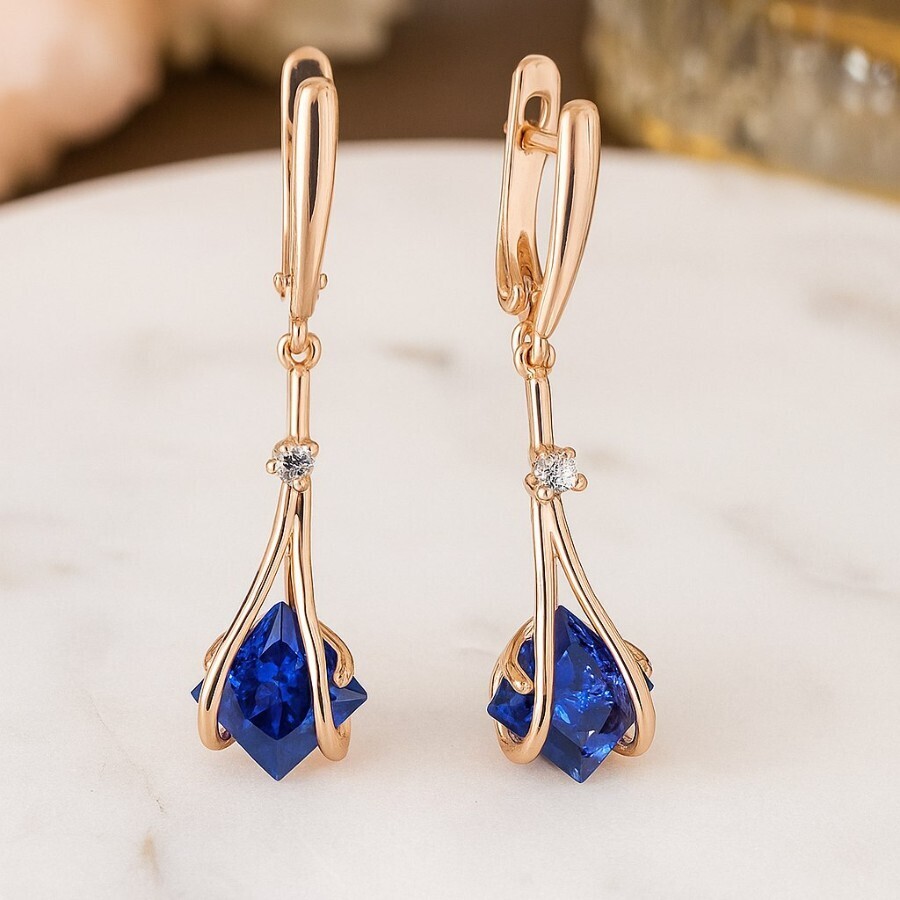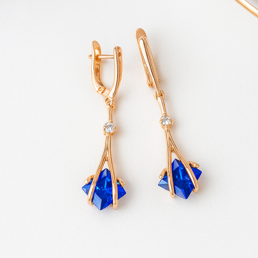 Серьги подвески длинные с синим камнем, покрытие позолота 585 пробы, арт.314.983