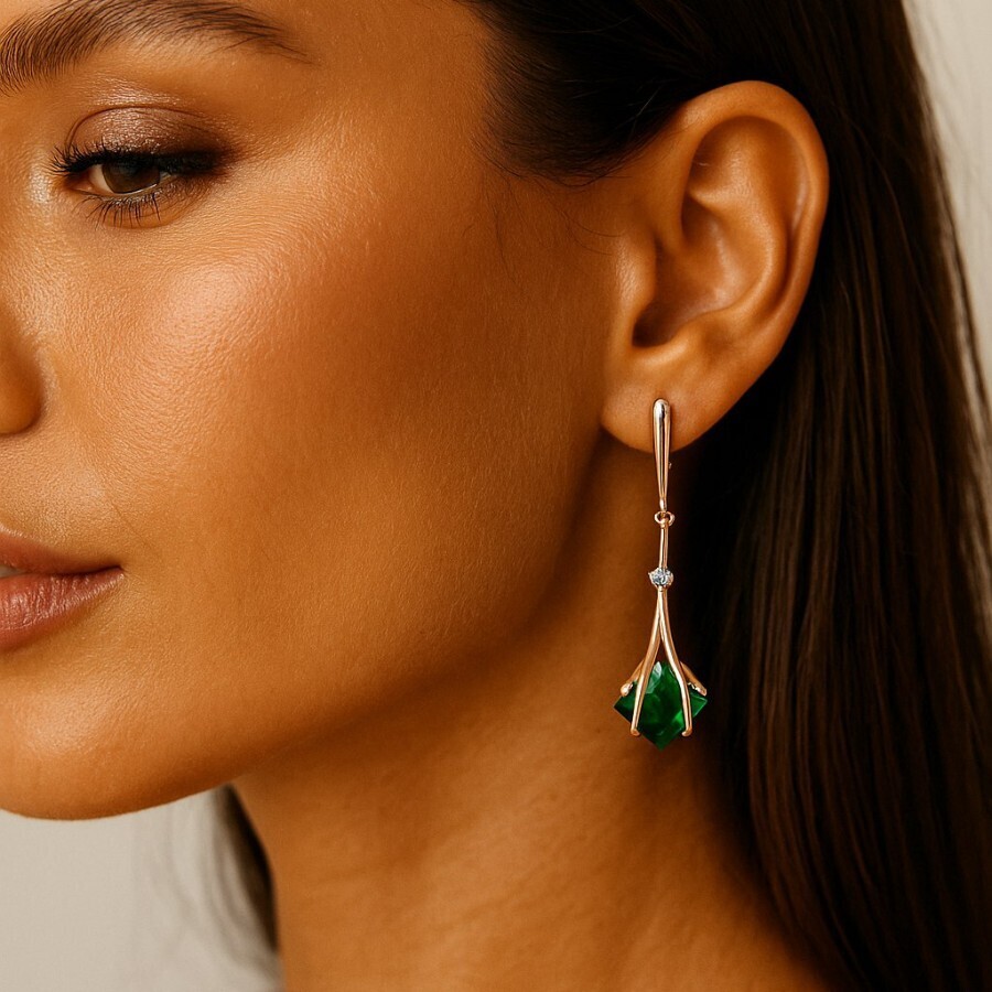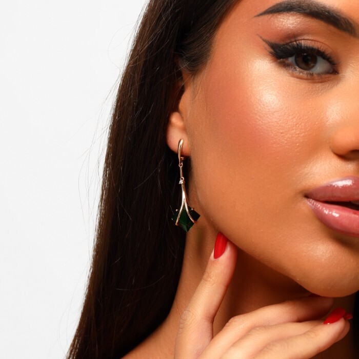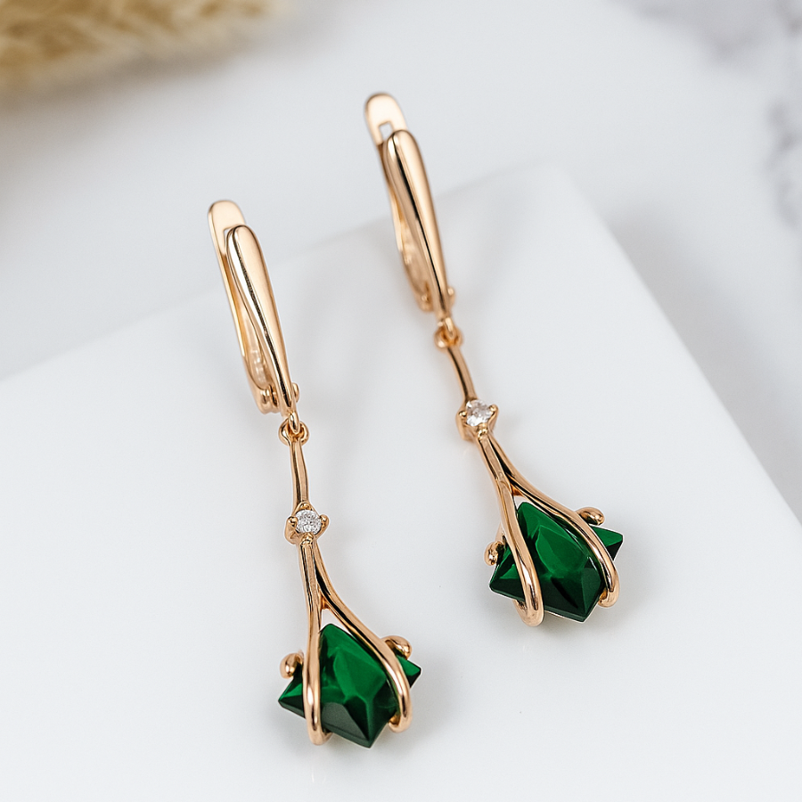 Серьги подвески длинные с зеленым камнем, покрытие позолота 585 пробы, арт.314.981
