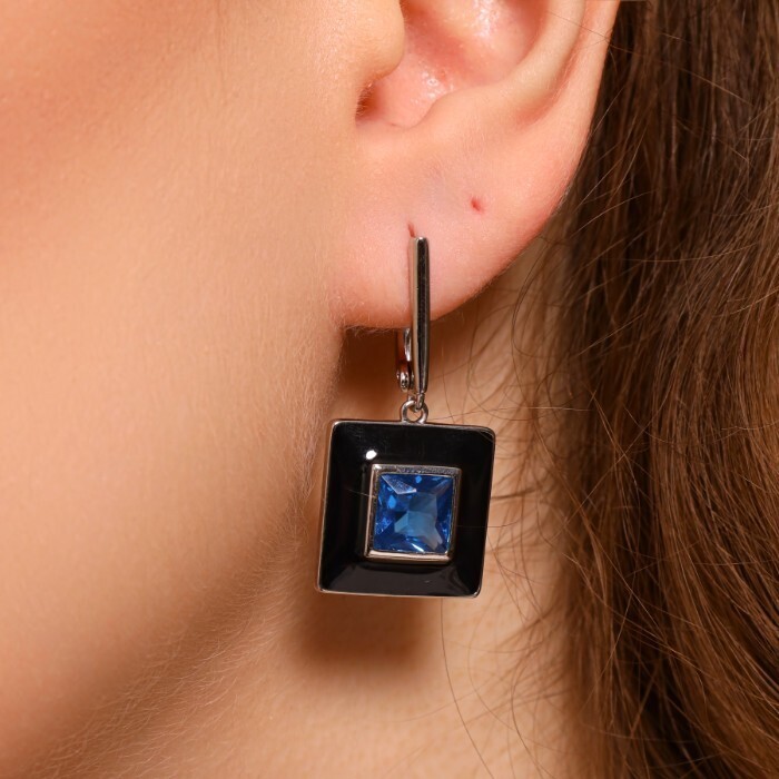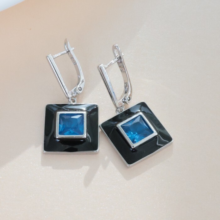 Серьги подвески с камнем, покрытие посеребрение, вставка: эмаль и фианиты, цвет: черный и синий, арт.215.283