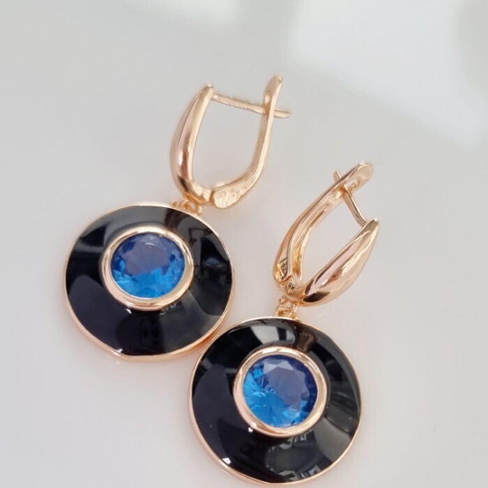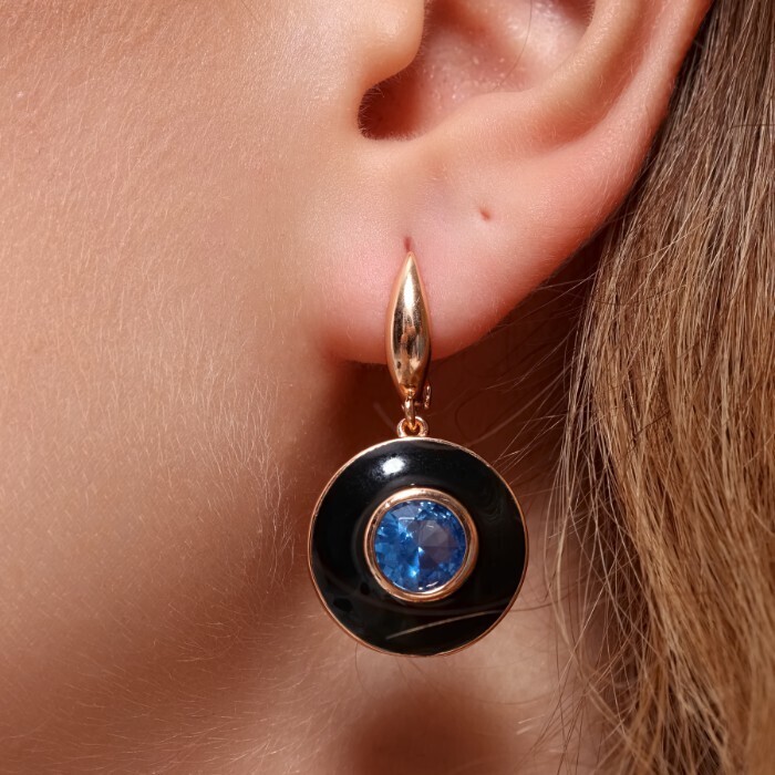 Серьги подвески ювелирная бижутерия коллекция "Дубай" покрытие позолота, вставка: цветная эмаль и крупный фианит, цвет: голубой и черный, арт.215.350