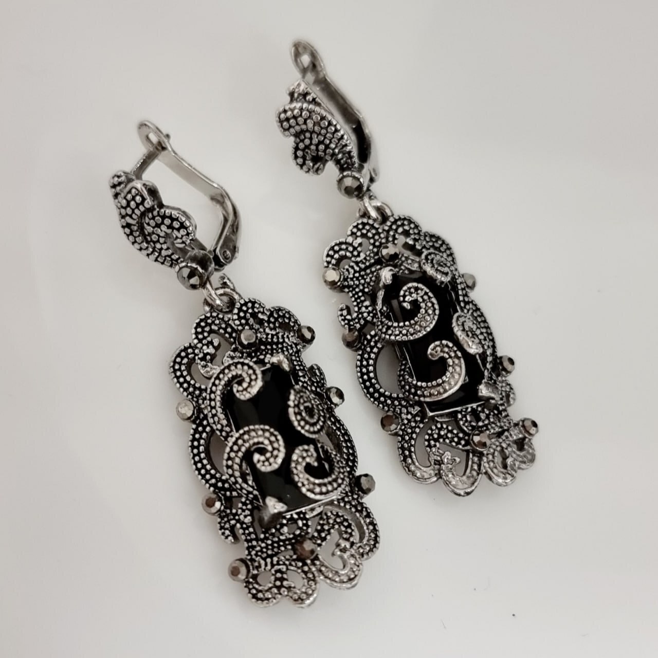 Серьги подвески ювелирная бижутерия, покрытие посеребрение, вставка: фианиты, цвет графит и черный, Уценка, арт.213.735