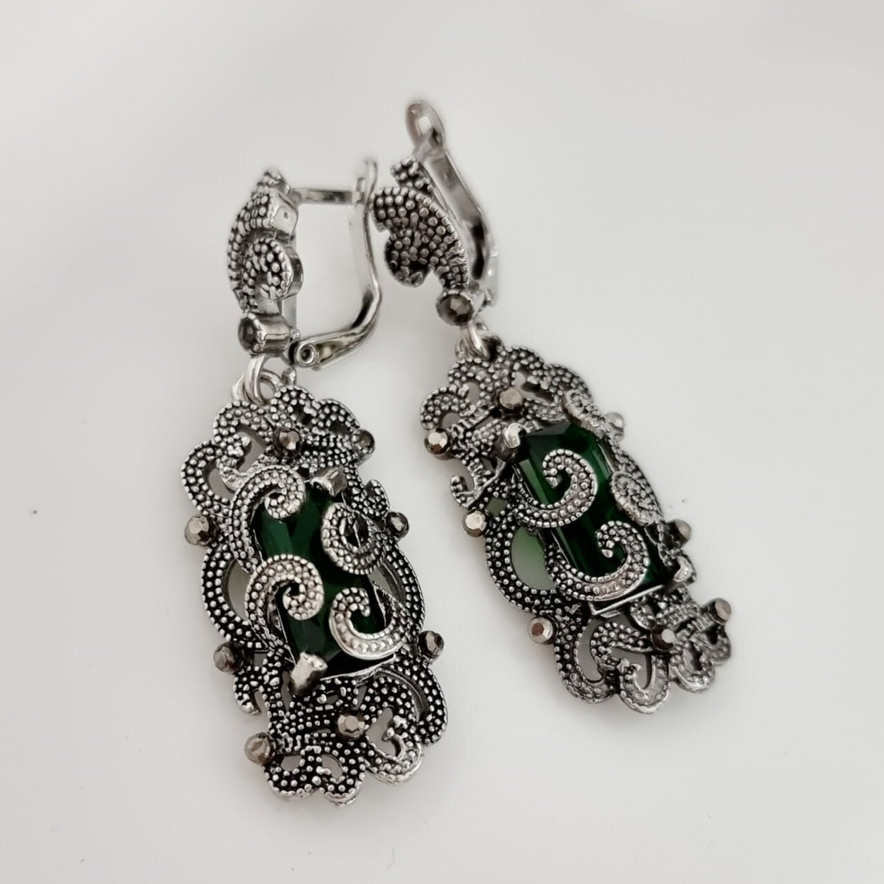 Серьги подвески ювелирная бижутерия, покрытие посеребрение, вставка: фианиты, цвет графит и зеленый, Уценка, арт.213.741