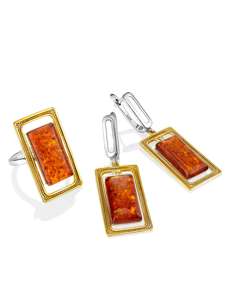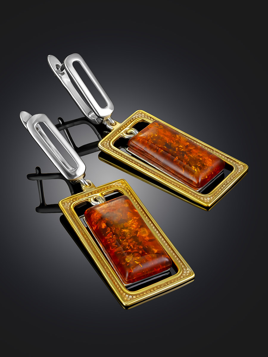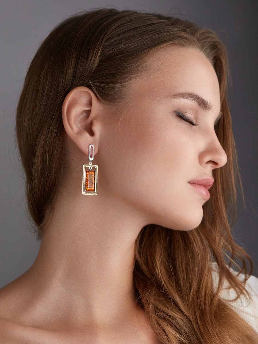Серьги прямоугольники из коньячного янтаря в позолоченной оправе «Челси»