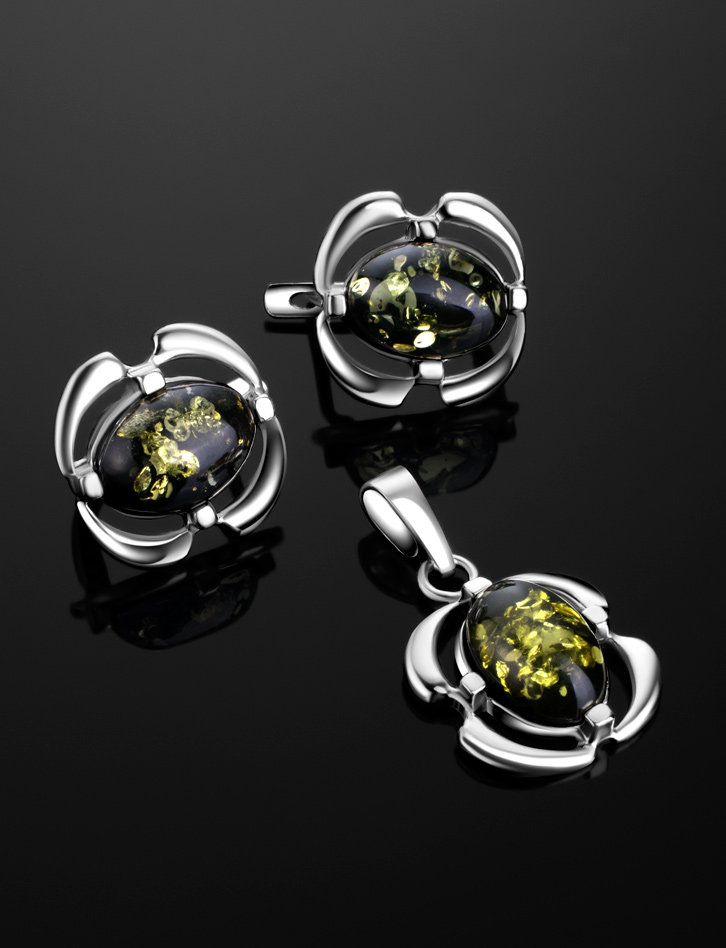 Серьги с цельным янтарём зелёного цвета «Фиалка»