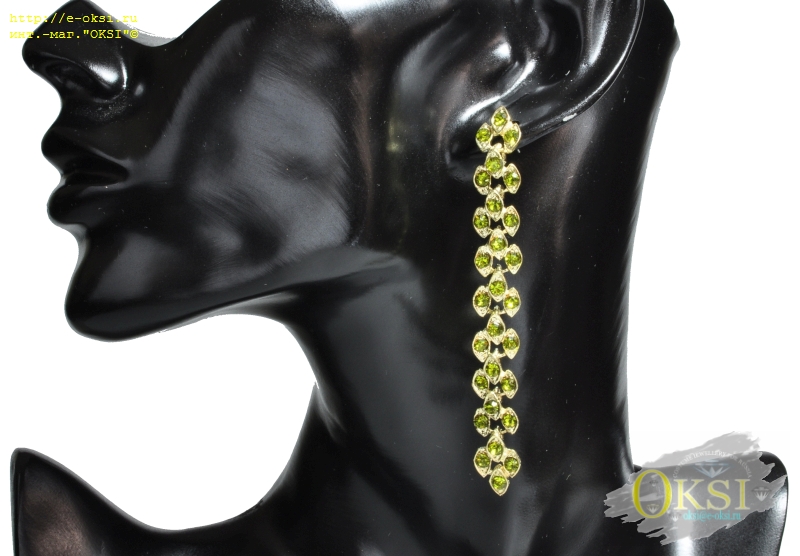 Эффектные, длинные серьги украшены сверкающими изумрудно-оливковыми кристаллами. Длина 8,5 см. Качественное родиевое покрытие золотого цвета.