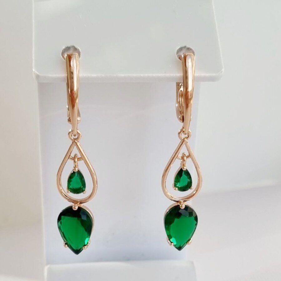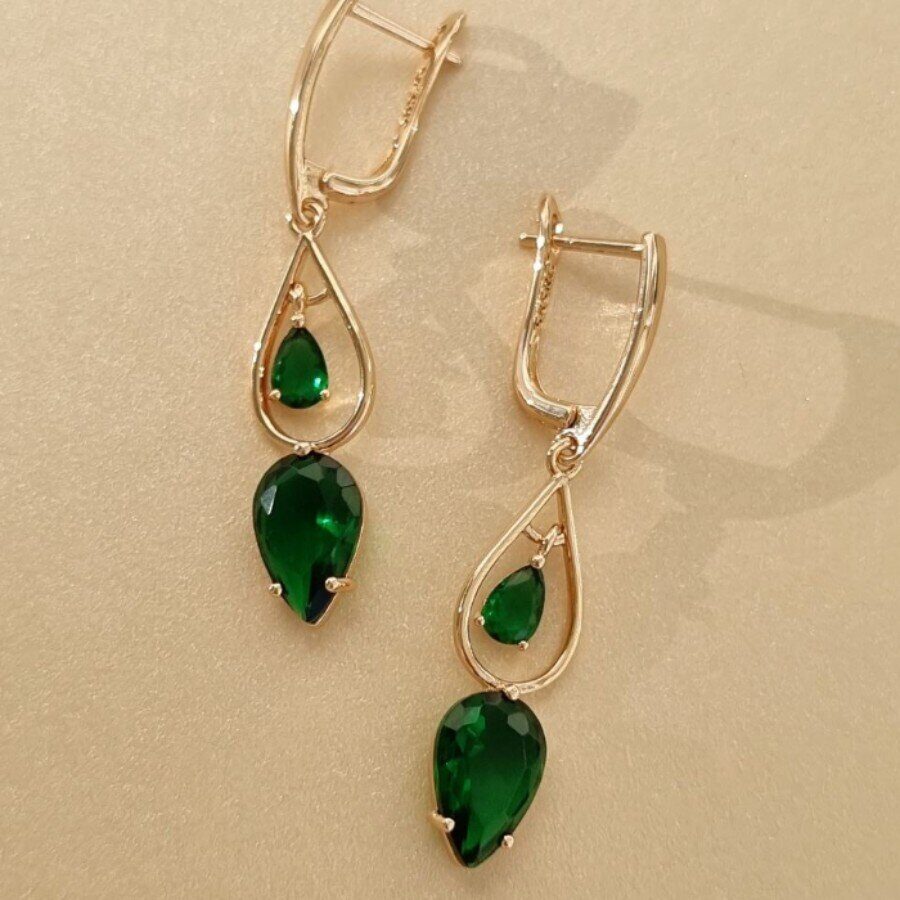 Серьги висячие с зелеными камнями, покрытие позолота 585 пробы, арт.212.049