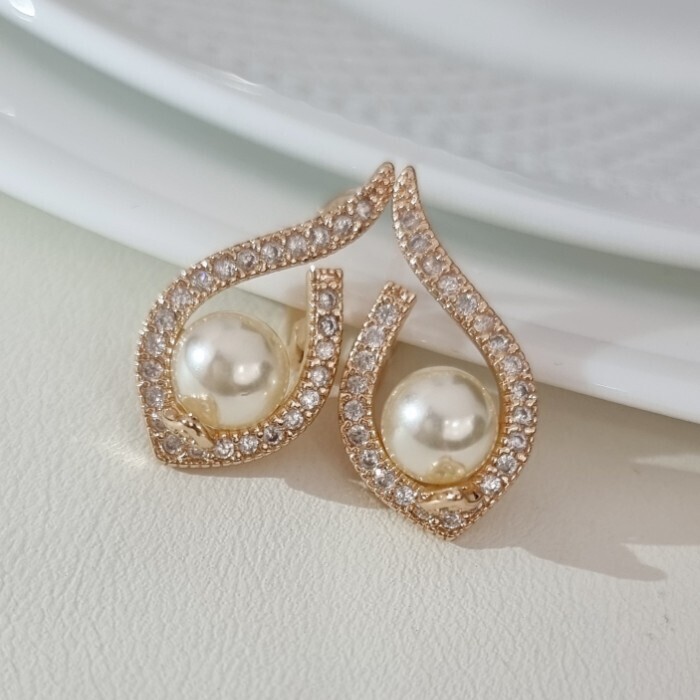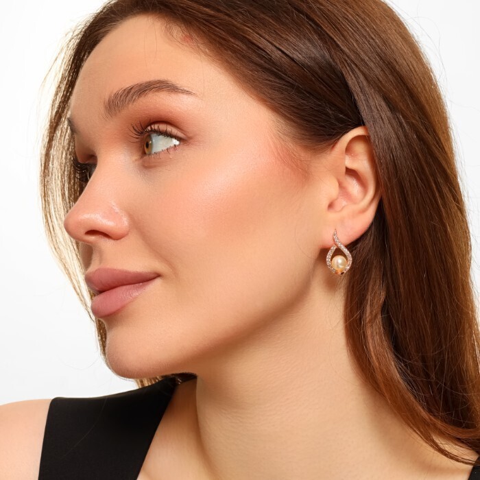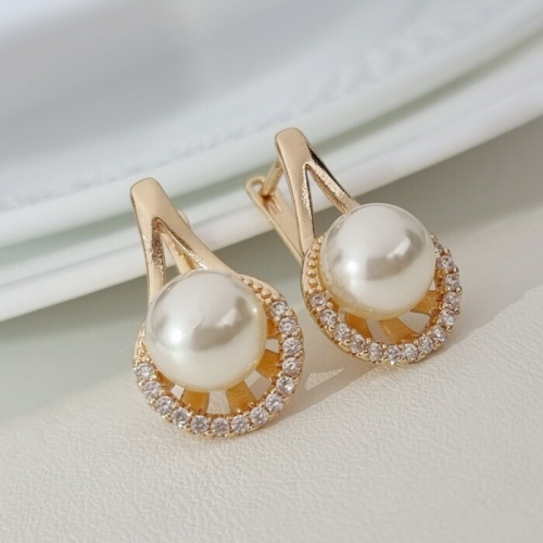 Серьги ювелирная бижутерия Дубайское золото, с покрытием позолотой 18К, вставка: фианиты и искуственный жемчуг, цвет: прозрачный, арт.216.182