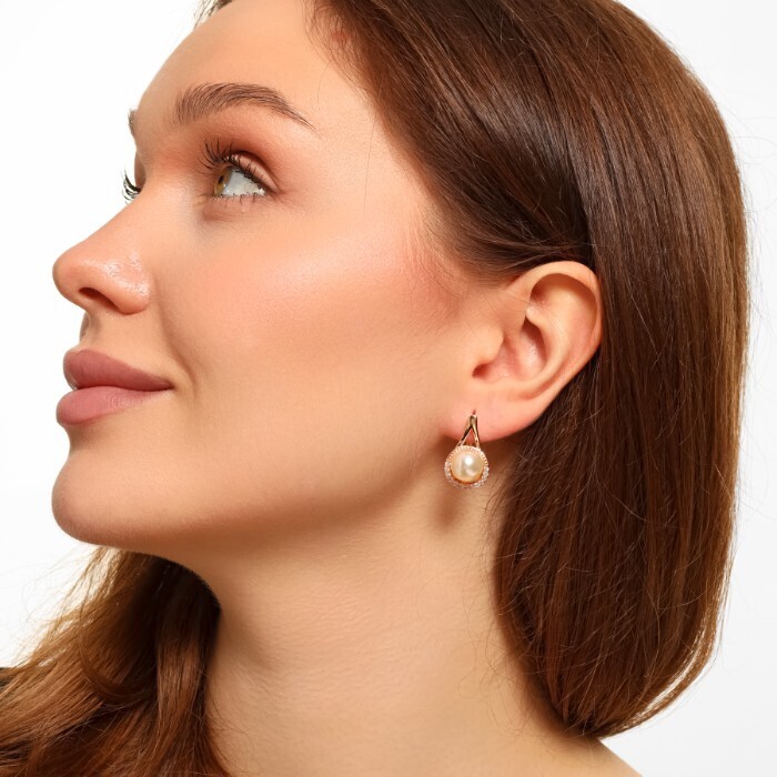 Серьги ювелирная бижутерия Дубайское золото, с покрытием позолотой 18К, вставка: фианиты и искуственный жемчуг, цвет: прозрачный, арт.216.183