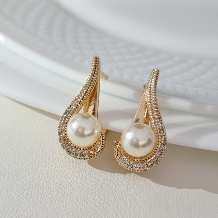 Серьги ювелирная бижутерия Дубайское золото, с покрытием позолотой 18К, вставка: фианиты и искуственный жемчуг, цвет: прозрачный, арт.217.188