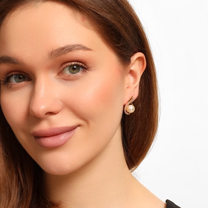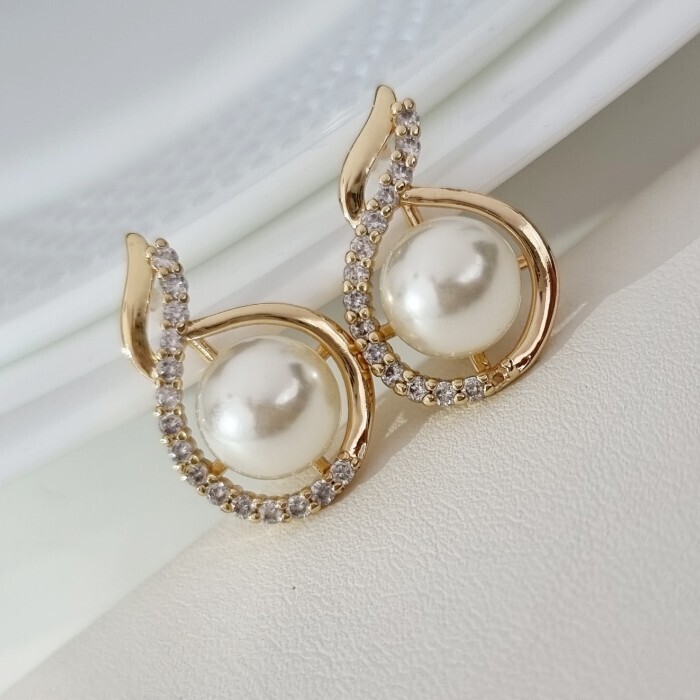 Серьги ювелирная бижутерия Дубайское золото, с покрытием позолотой 18К, вставка: фианиты и искуственный жемчуг, цвет: прозрачный, арт.216.189