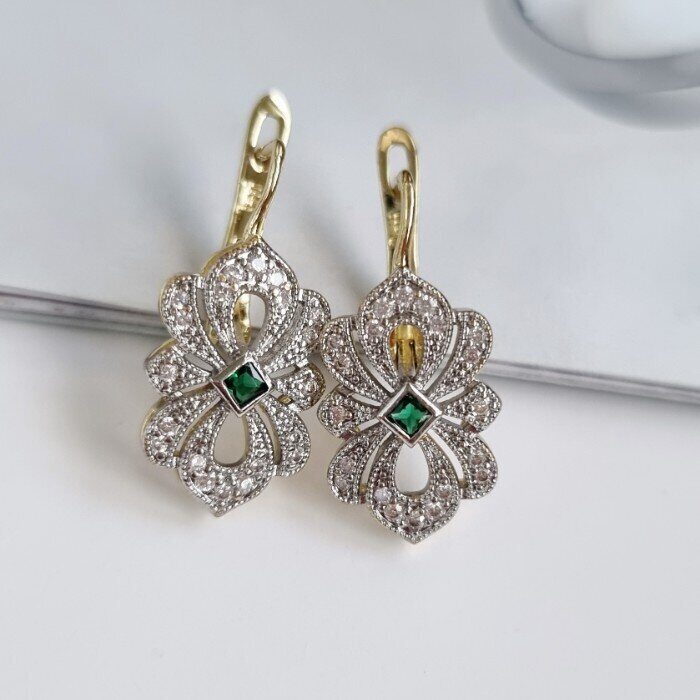 Серьги ювелирная бижутерия Итальянское золото (покрытие желтое 14к), вставка: фианиты, цвет: прозрачный и зеленый, арт.217.134