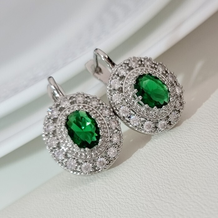 Серьги ювелирная бижутерия коллекция "Дубай", покрытие посеребрение, встака: фианиты, цвет: зеленый и прозрачный, арт.216.228
