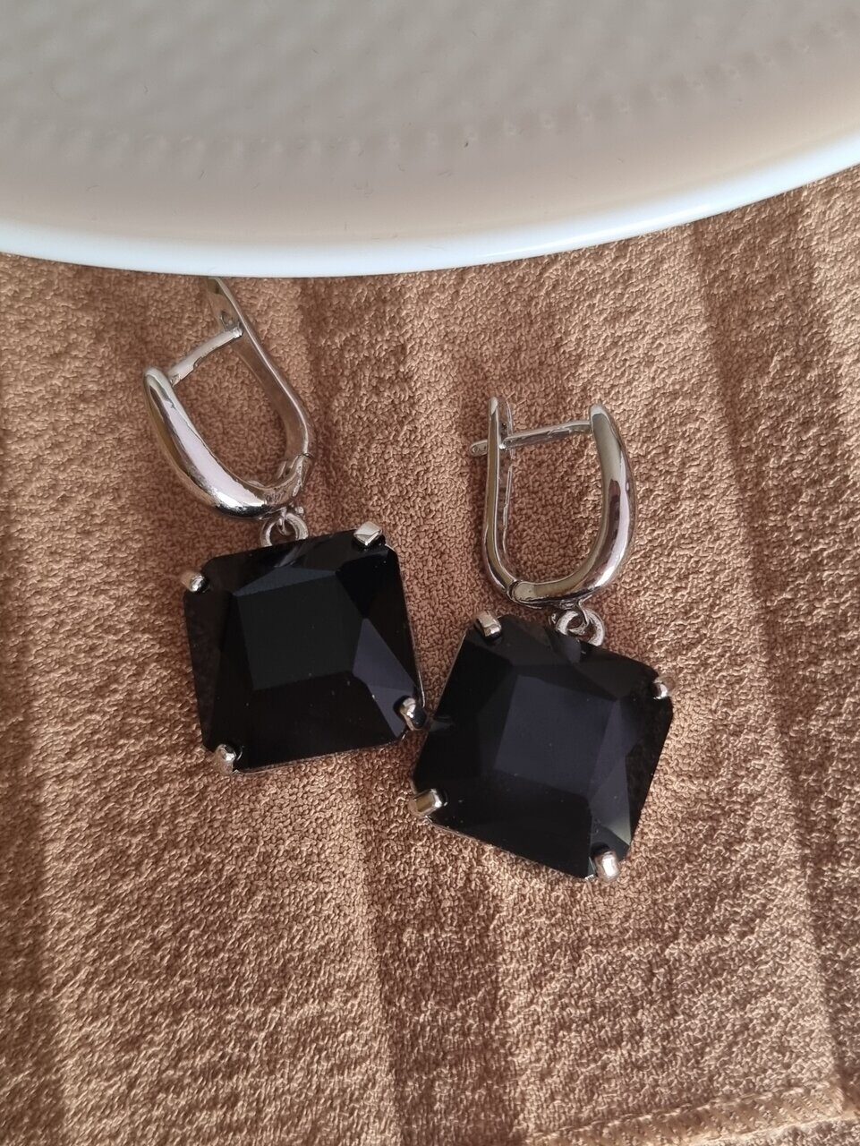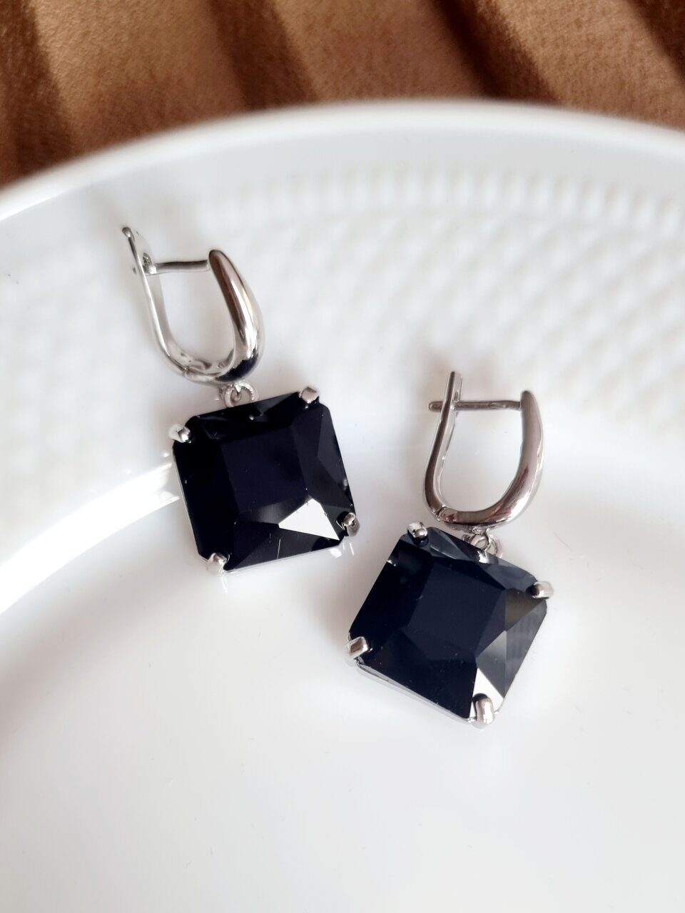 Серьги ювелирная бижутерия крупные под серебро, черный камень, 65145, арт.032.391
