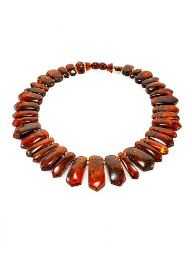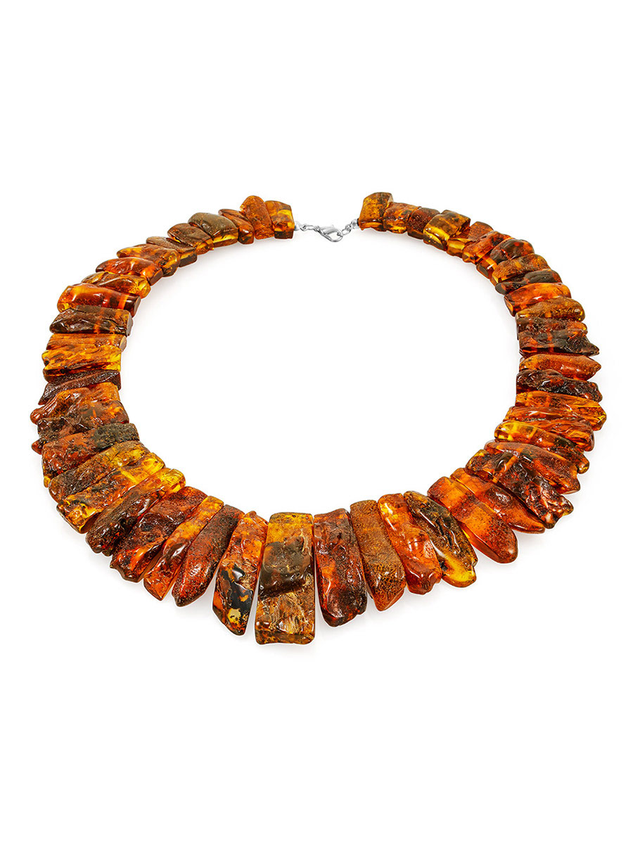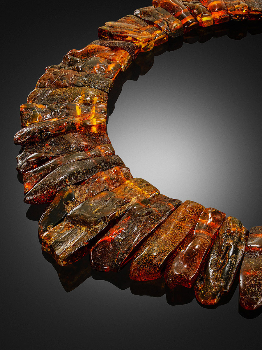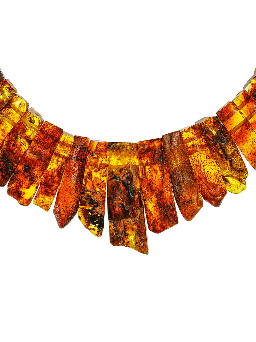 Это оригинальное эффектное колье понравится всем любительницам необычных и броских аксессуаров, поклонницам этнического стиля, а также тем, кто ищет в изделиях не только красоту, но и практическую пользу. Это колье создано из цельных кусочков натурального балтийского янтаря с живописной текстурой и обладает всеми полезными свойствами, которым так славится янтарь. Оно оказывает положительное воздействие на здоровье (подробнее о лечебных свойствах янтаря), а также позитивно влияет на эмоциональное состояние человека. Такое украшение отлично впишется и в повседневные, и в этнические образы, а самые смелые особы могут надевать его даже к дополнение к вечерним нарядам с открытыми плечами.  _x000D_
