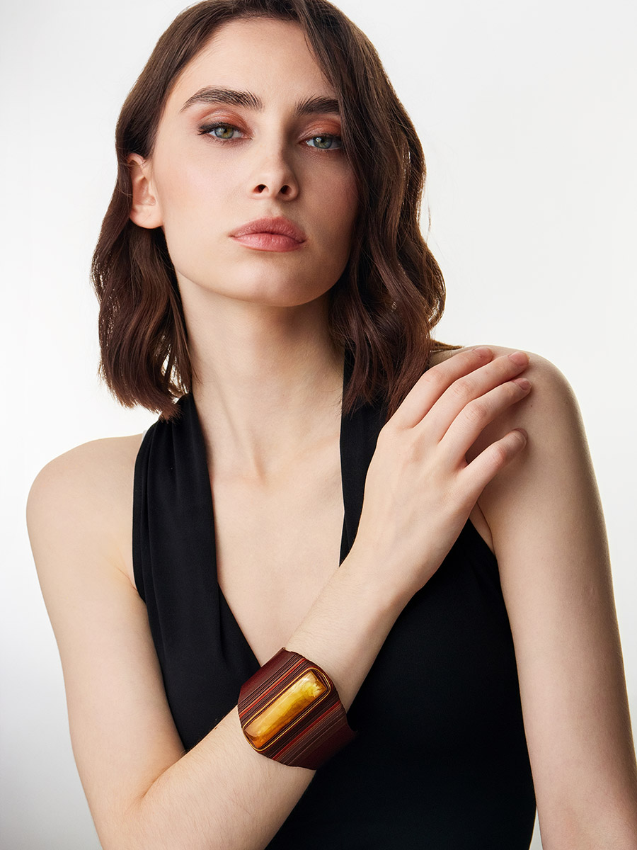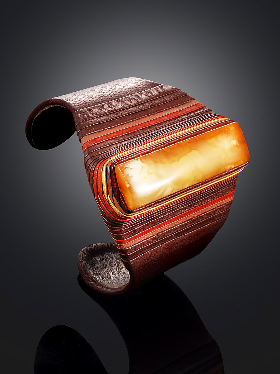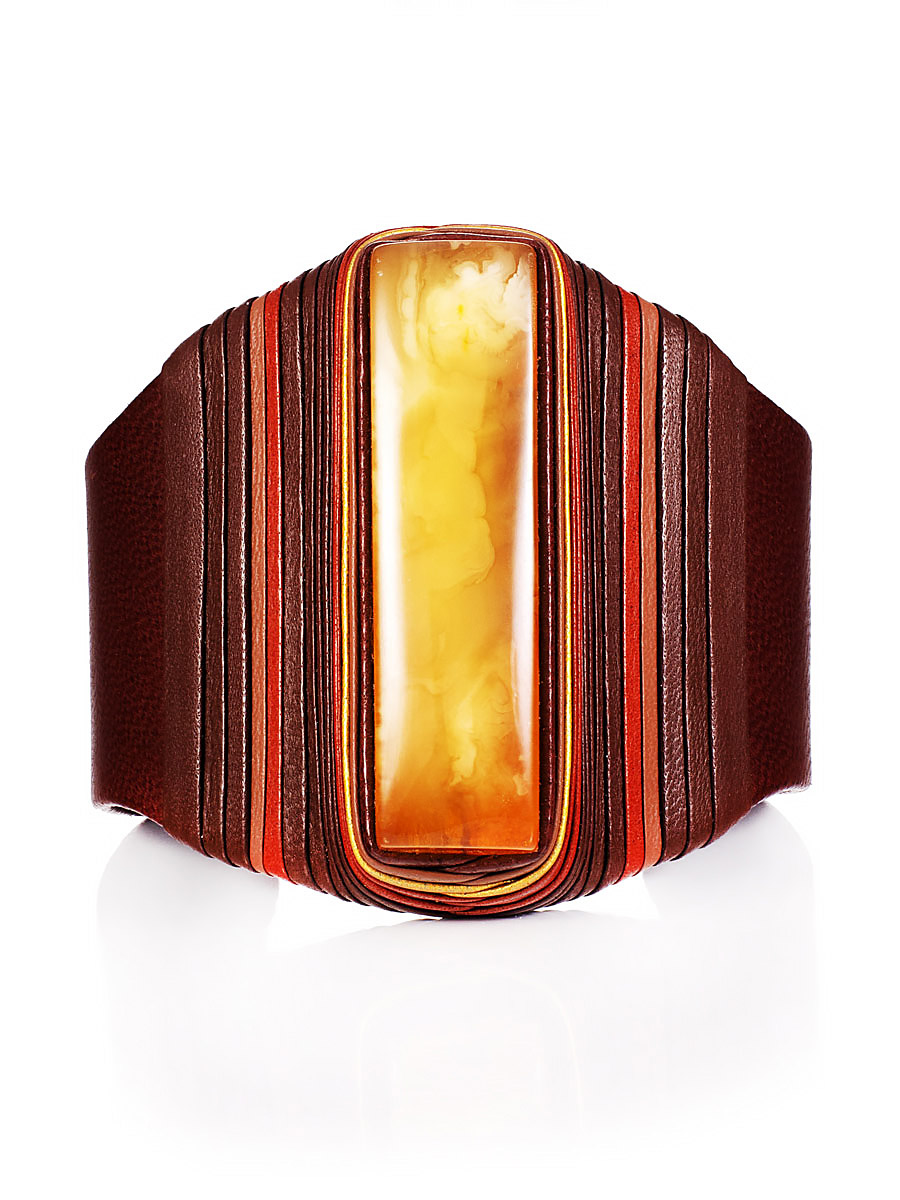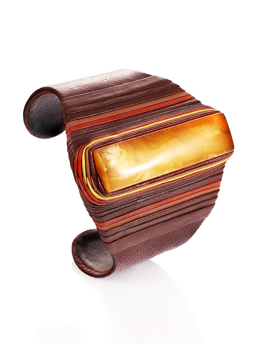 Широкий браслет из кожи тёмных оттенков и янтаря «Нефертити»