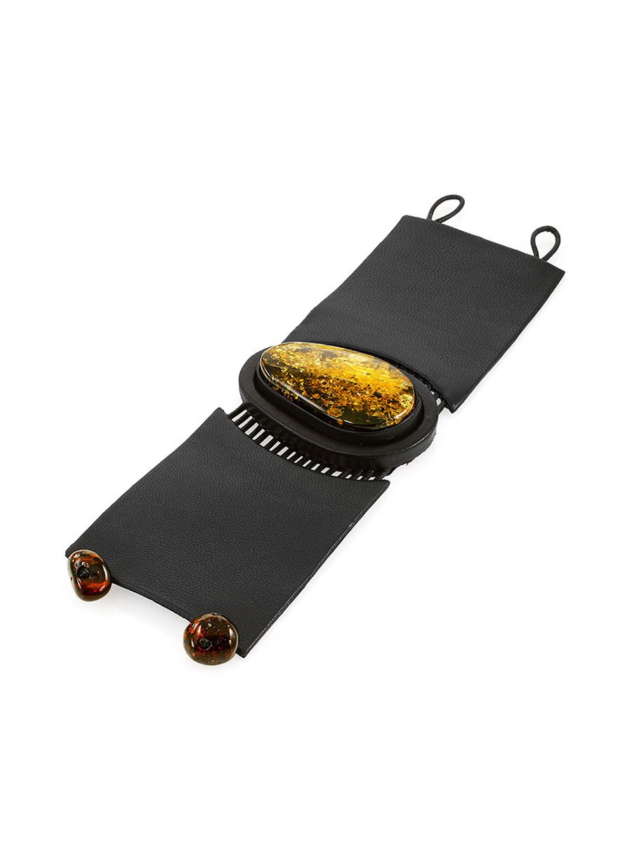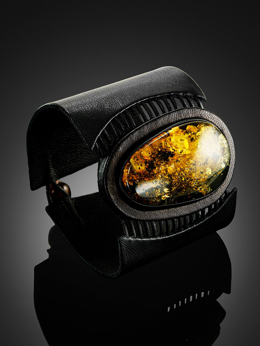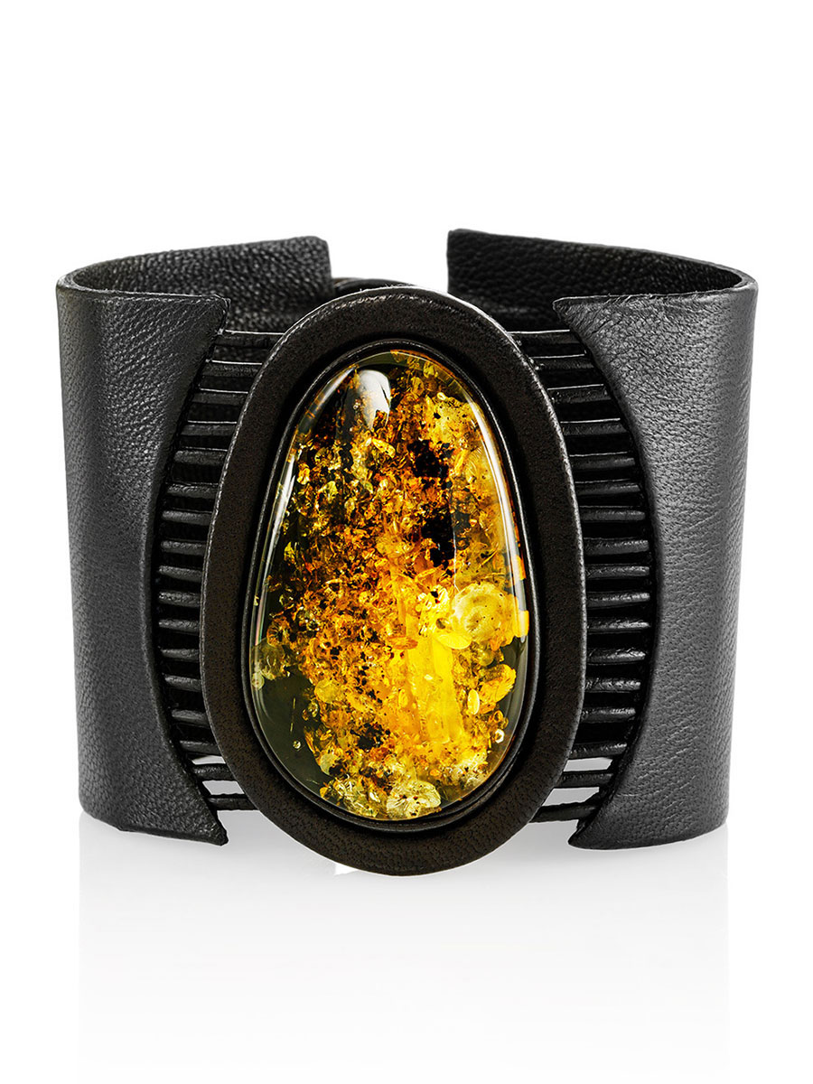 Широкий браслет из натуральной кожи с вставкой из балтийского янтаря «Амазонка»