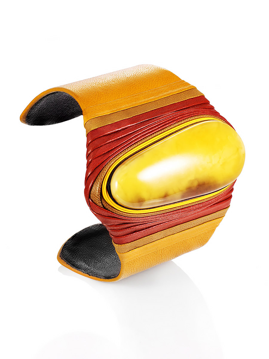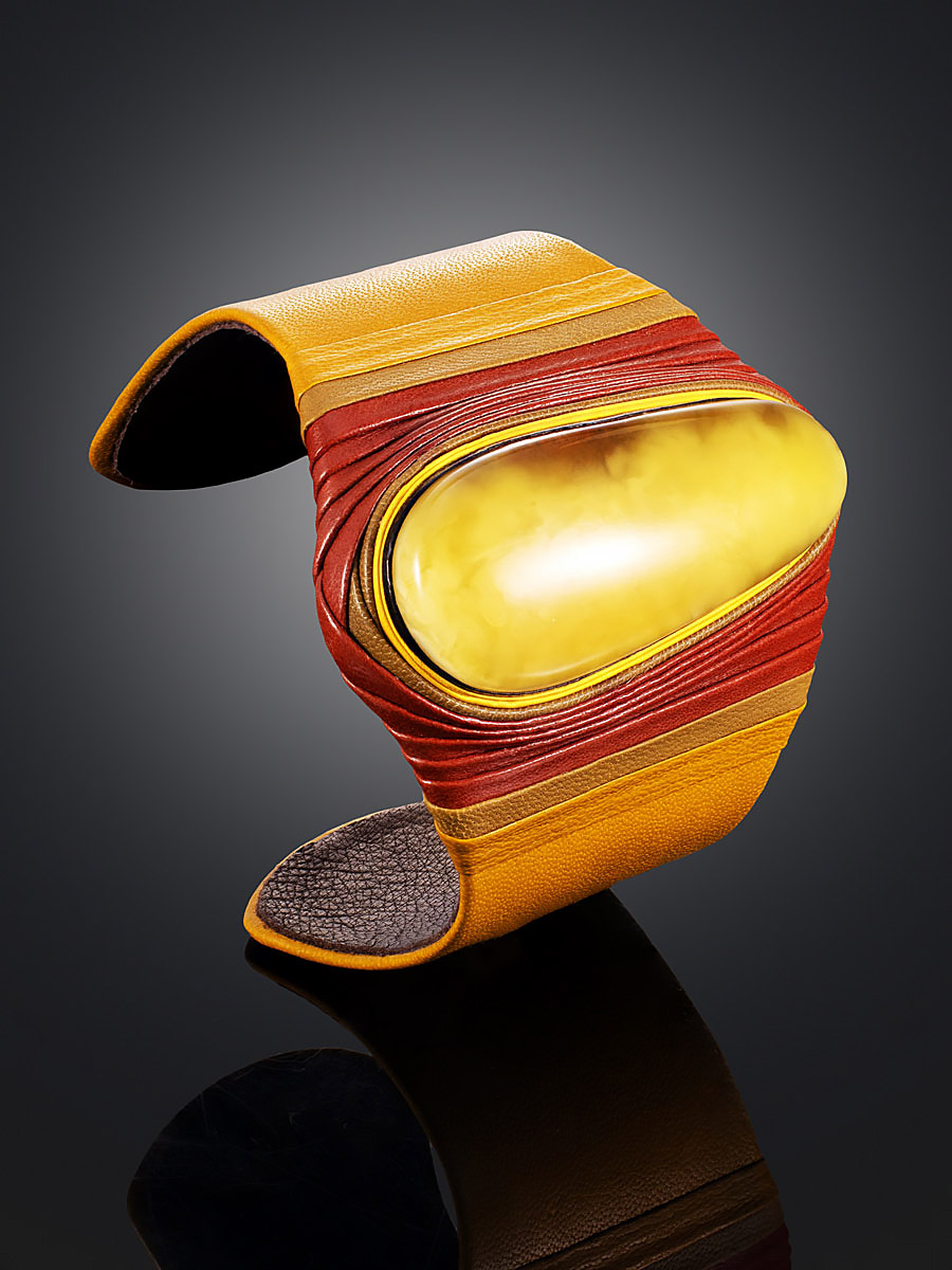 Широкий стильный браслет «Нефертити» из кожи и натурального янтаря