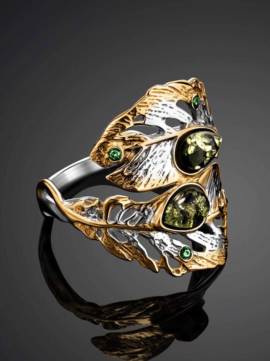 Широкое кольцо с зелёным янтарём «Павлин»