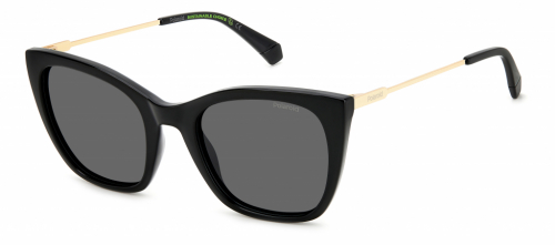 Солнцезащитные очки с линзами, совместимыми с RX-функцией, в комбинированной рамке с женственной передней частью в форме кошачий глаз из Tritan renew, что отражает выбор экологически чистых материалов бренда. Тонкие металлические заушники дополнены культовыми наконечниками контрастного цвета - отличительной чертой Polaroid.
