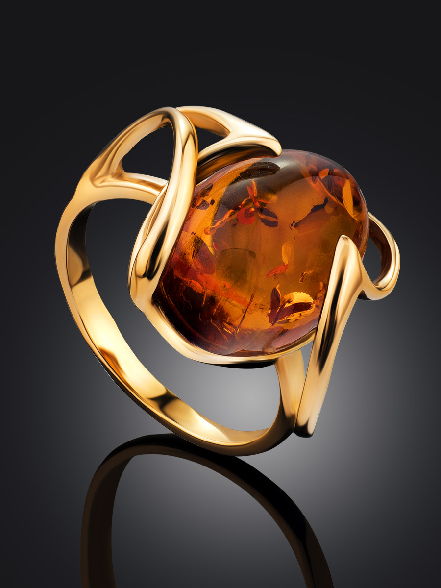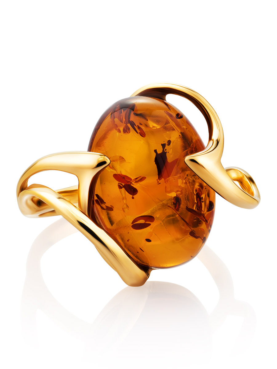 Стильное кольцо «Палермо» из позолоченного серебра с коньячным янтарём