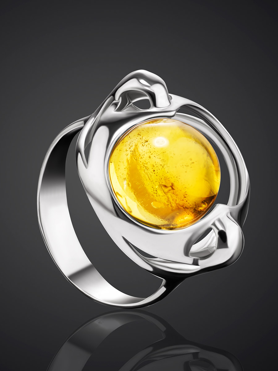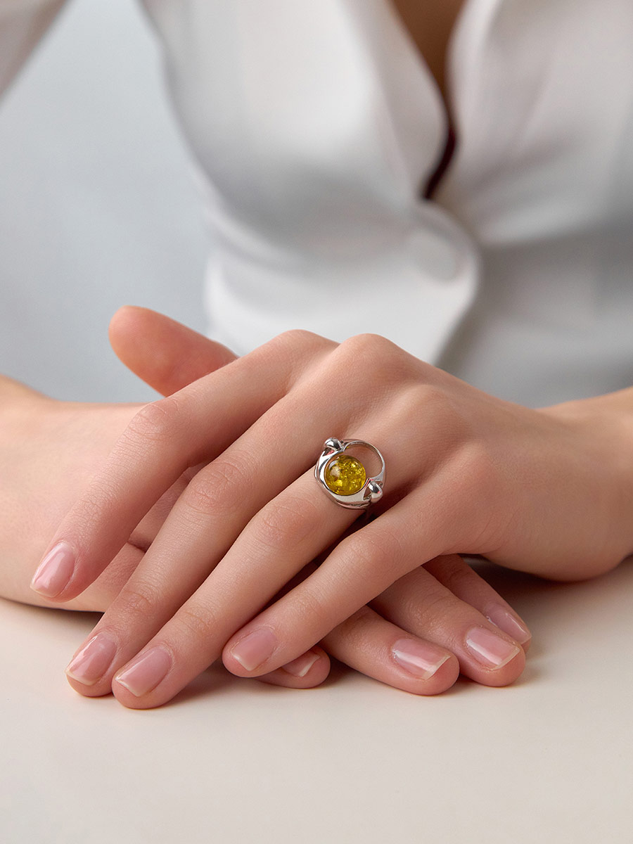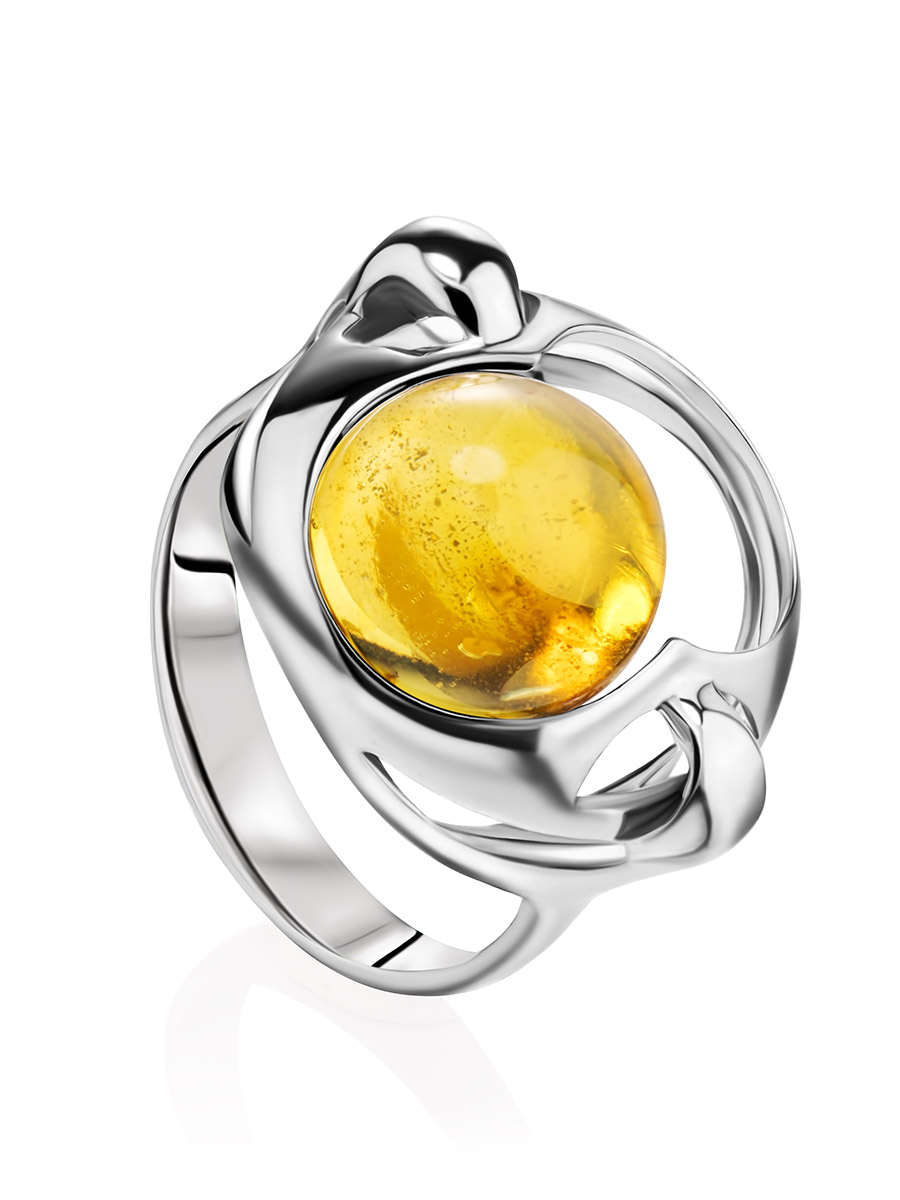 Стильное кольцо с круглой вставкой из натурального искрящегося лимонного янтаря «Орион»