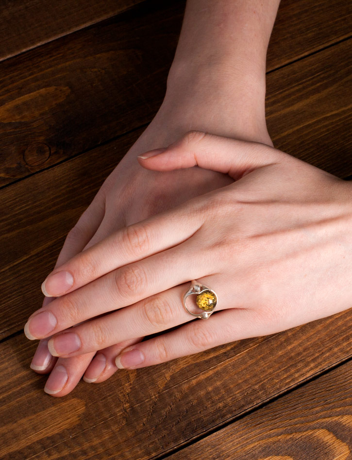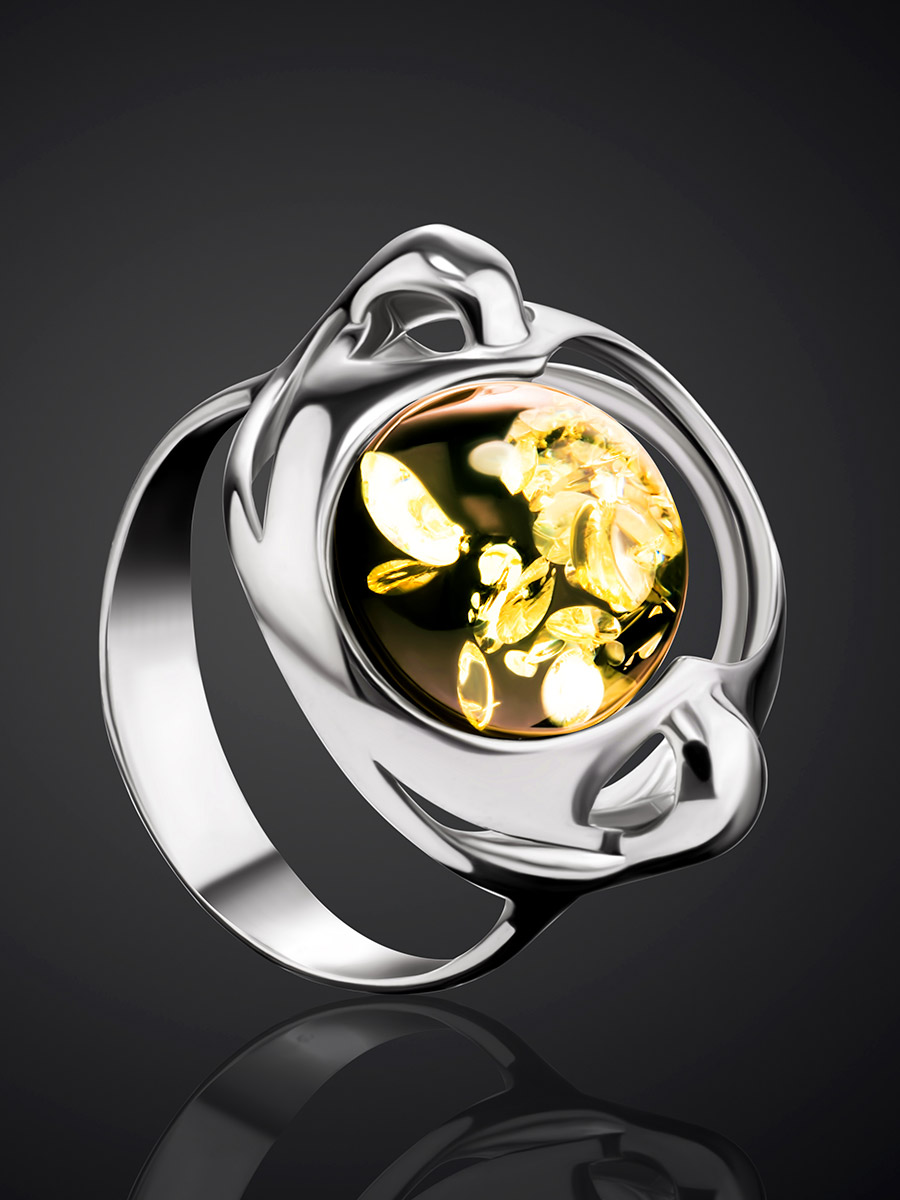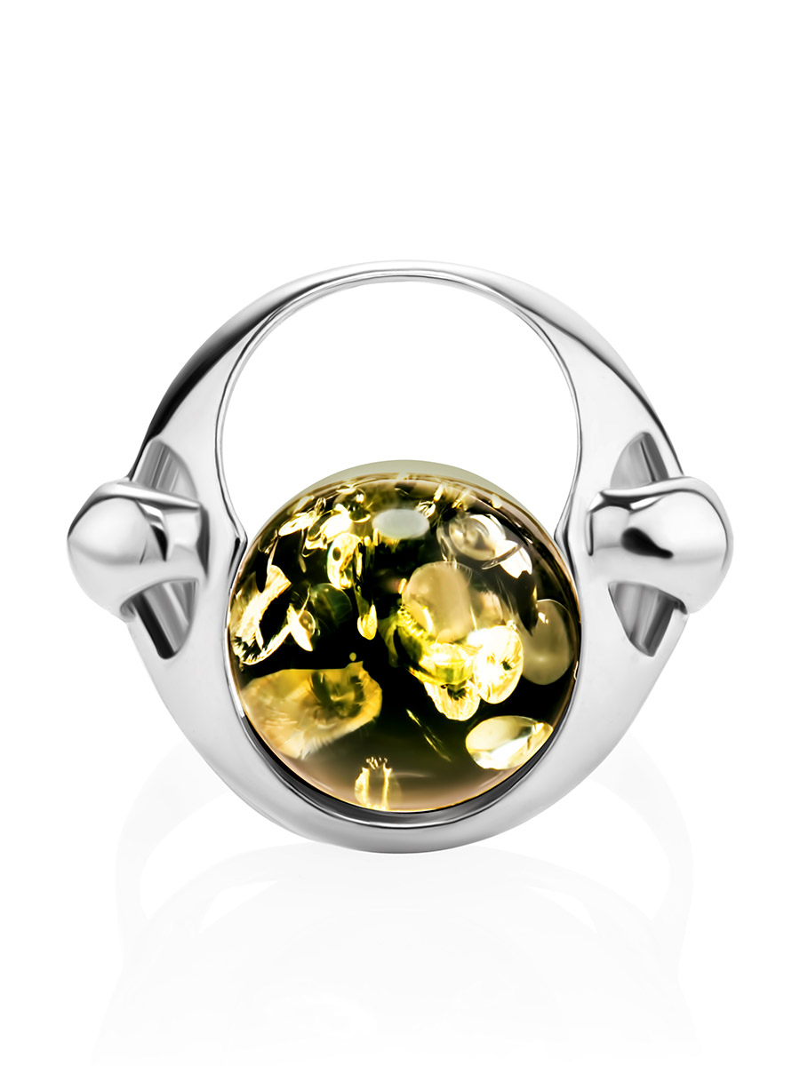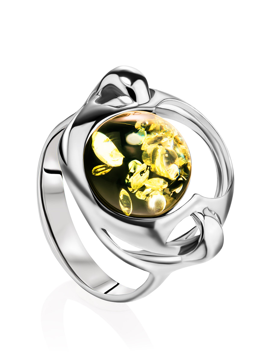 Стильное кольцо с круглой вставкой из натурального искрящегося зеленого янтаря «Орион»
