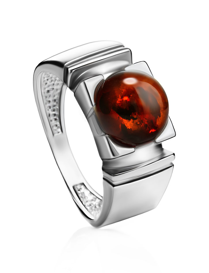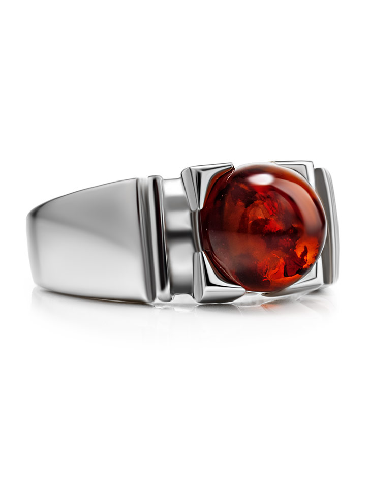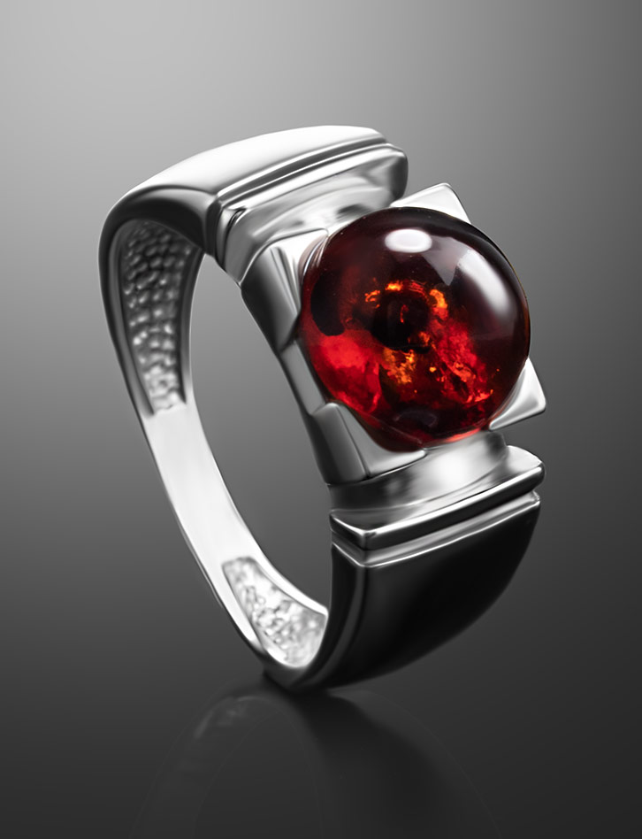 Стильное кольцо с круглой вставкой из натурального янтаря вишневого цвета «Рондо»