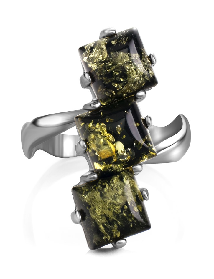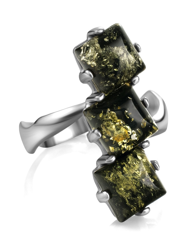 Стильное кольцо с натуральным зелёным янтарём «Зигзаг»