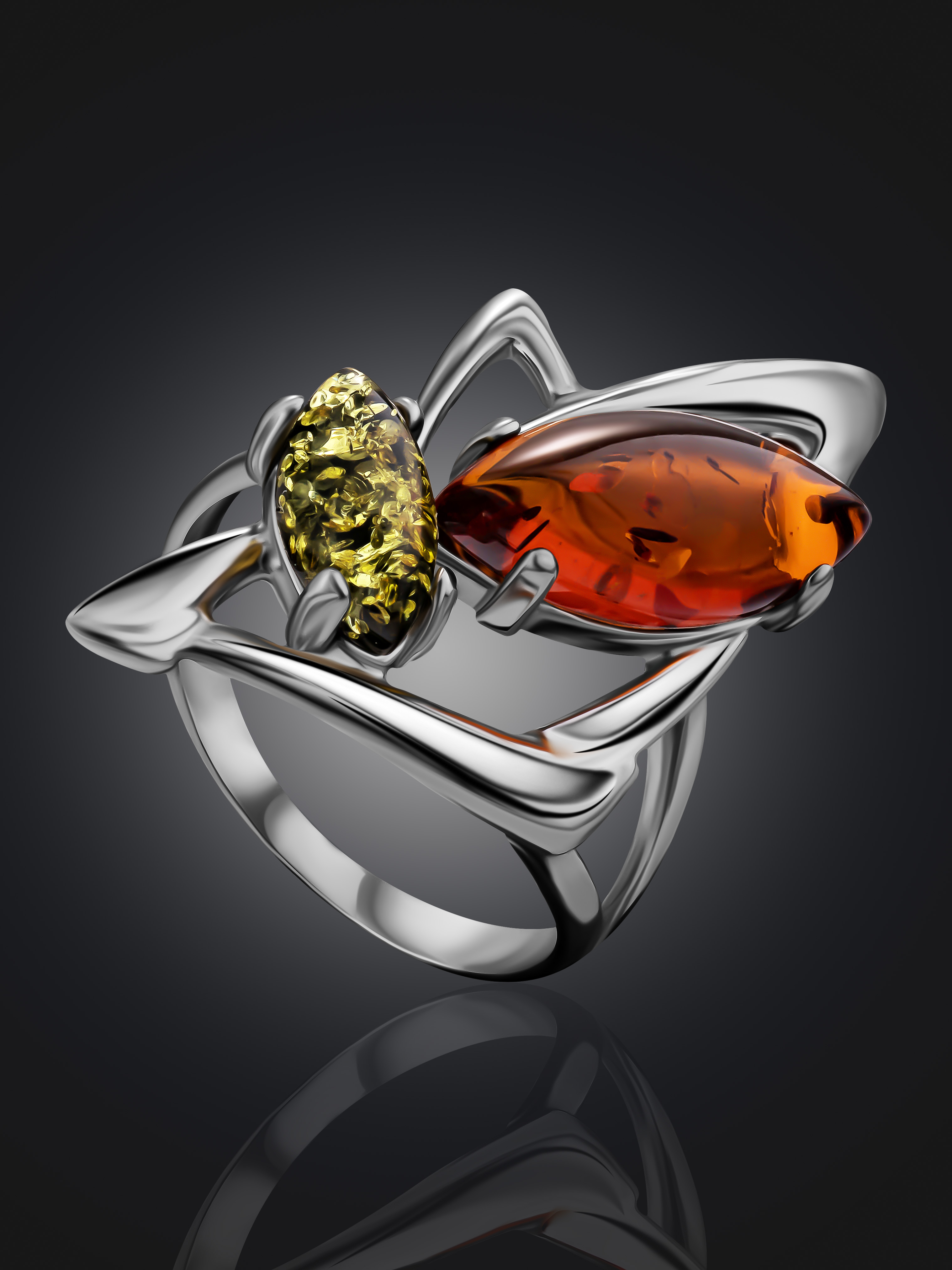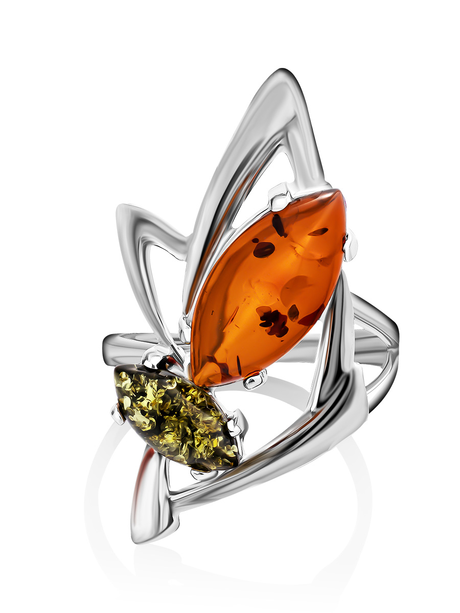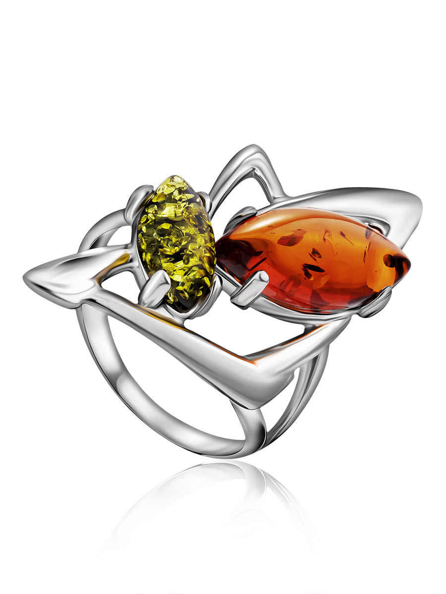 Стильное кольцо с вставками из натурального янтаря вишневого и зеленого цветов «Пегас»