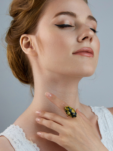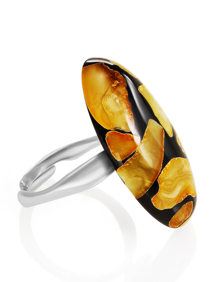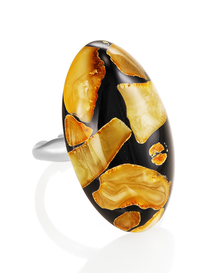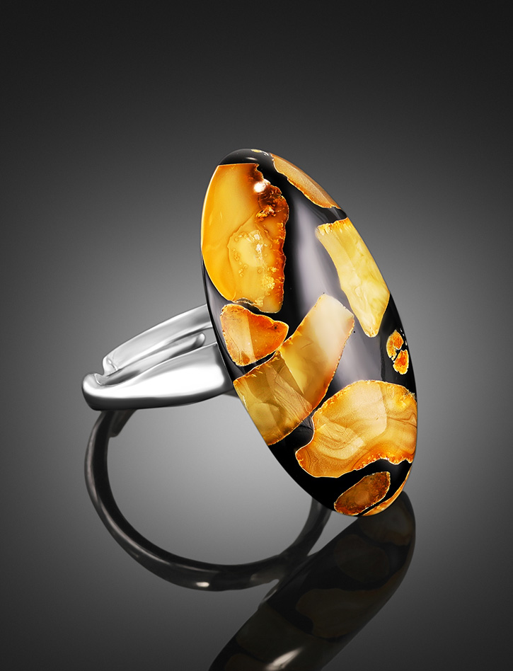 Стильное кольцо с янтарной мозаикой «Далматин чёрный»